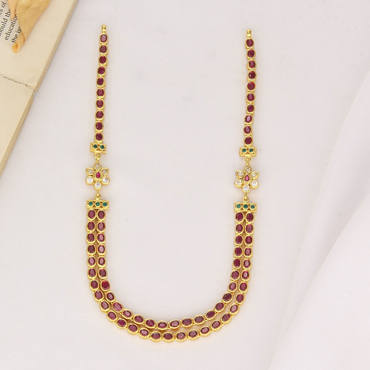 This 92.5 Silver, 24 kt gold-plated, stylish Necklace is studded with semi-precious stones to make a stunning statement. Perfect for any special occasion.