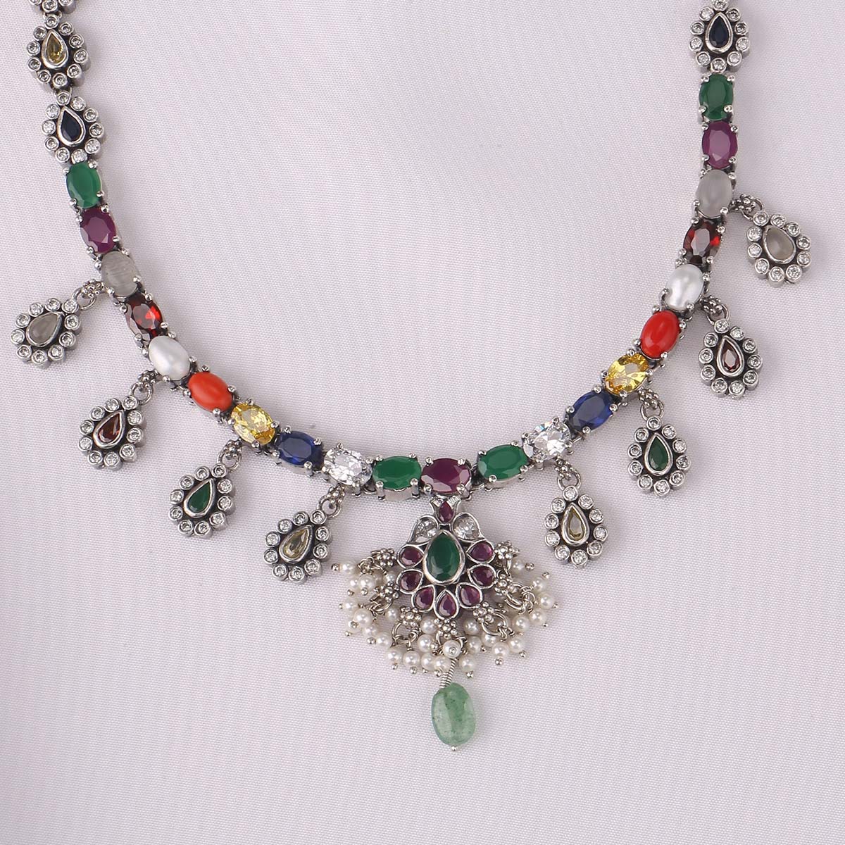 92.5 silver oxidized Necklace, Studded with Semi-Precious Stones.