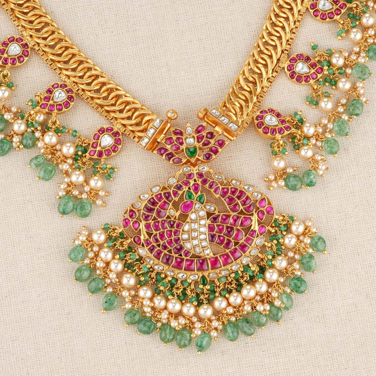 Crafted from 92.5% silver and enhanced with 24kt gold plating, this necklace set features exquisite floral kundan detailing for an elegant and luxurious appearance.