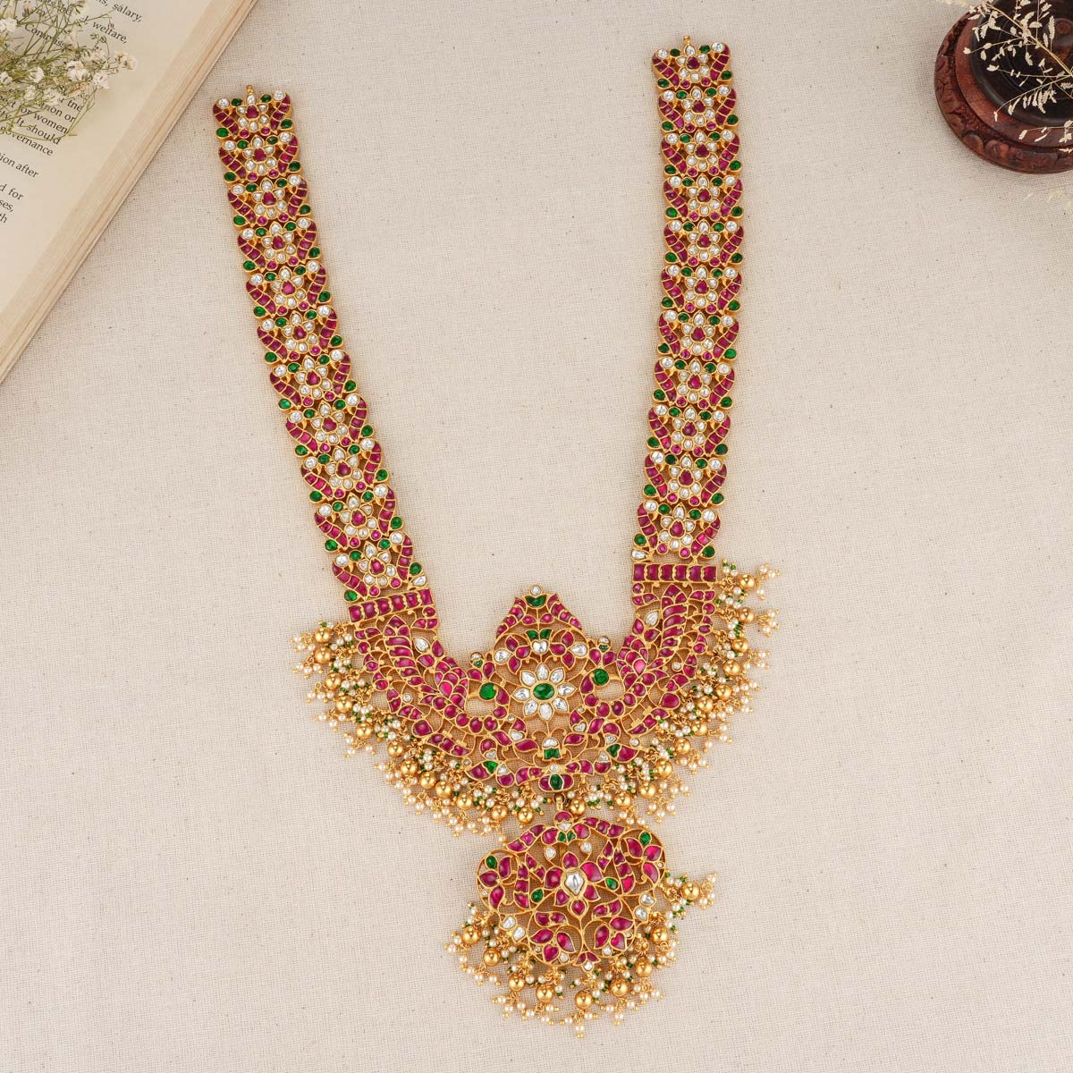 Crafted from 92.5% silver and enhanced with 24kt gold plating, this necklace set features exquisite floral kundan detailing for an elegant and luxurious appearance.