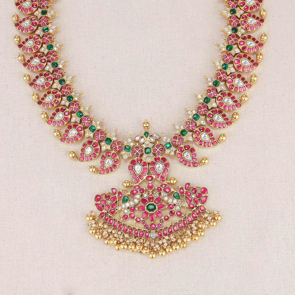 Crafted from 92.5% silver and enhanced with 24kt gold plating, this necklace set features exquisite floral kundan detailing for an elegant and luxurious appearance.