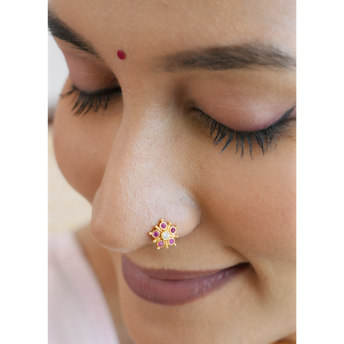 This nose pin is crafted with 92.5 silver and 24kt gold plating and is embellished with semi-precious stones for a beautiful finish. Non-pierced and with a stud enclosure, this piece is perfect for adding some subtle flair.