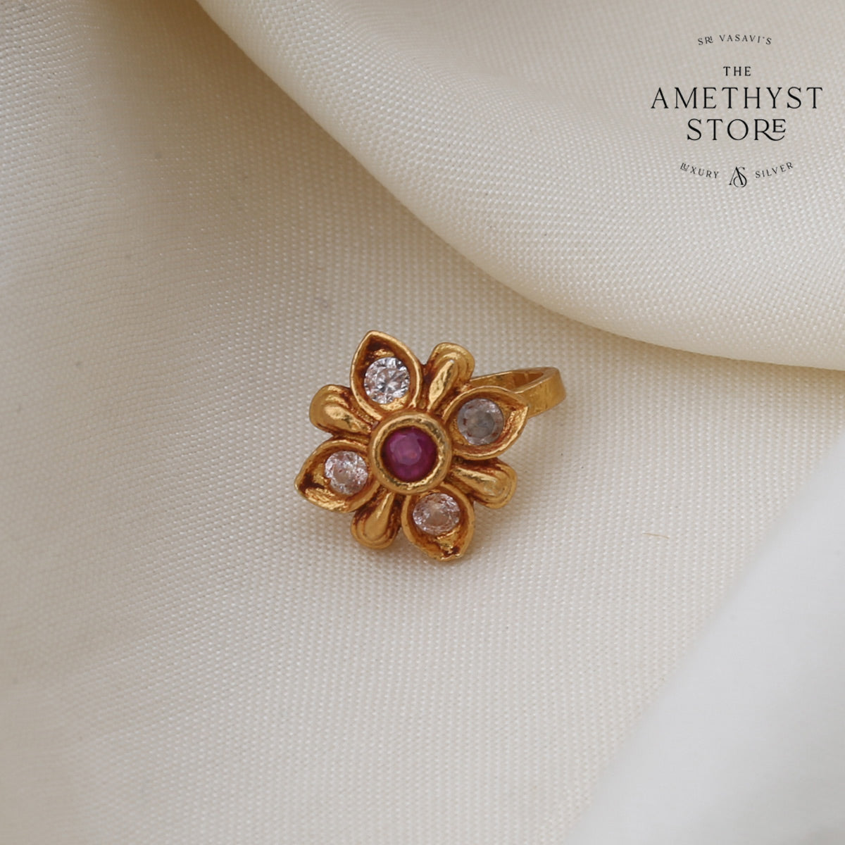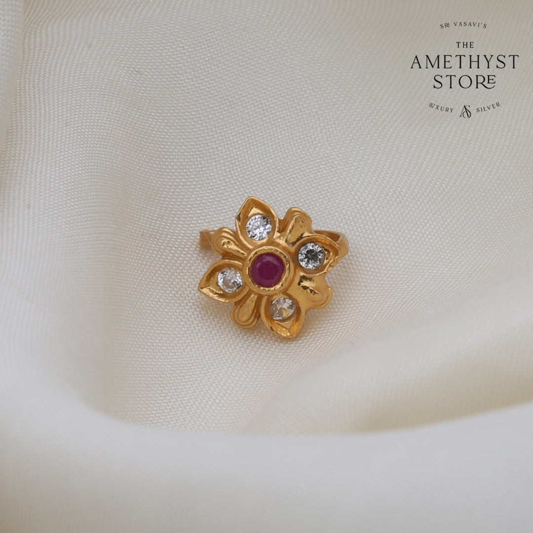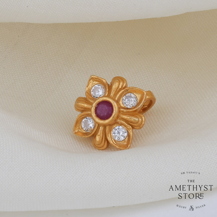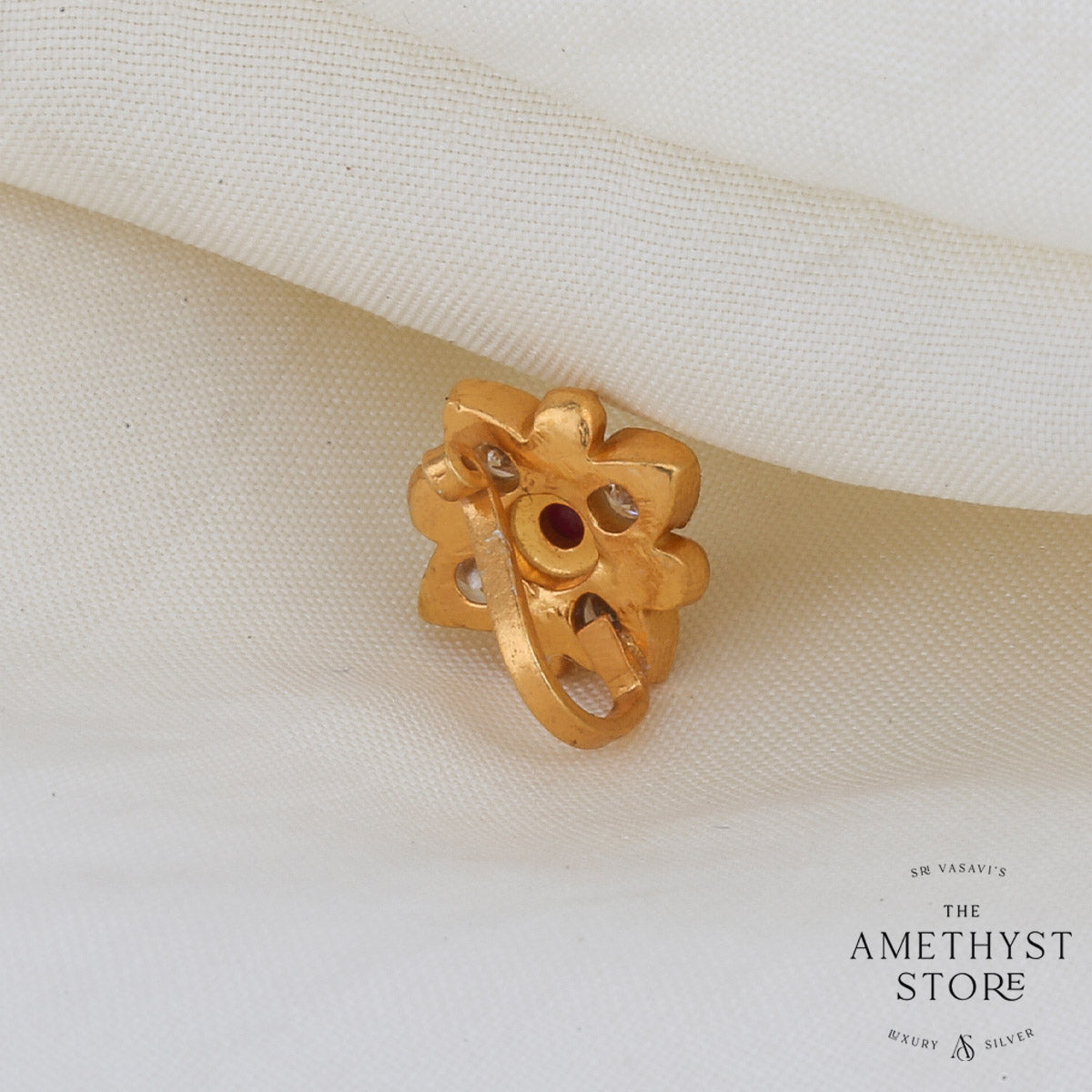 This nose pin is crafted with 92.5 sterling silver and 24-karat gold plating, containing semi-precious stones.