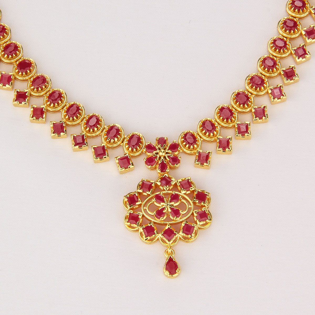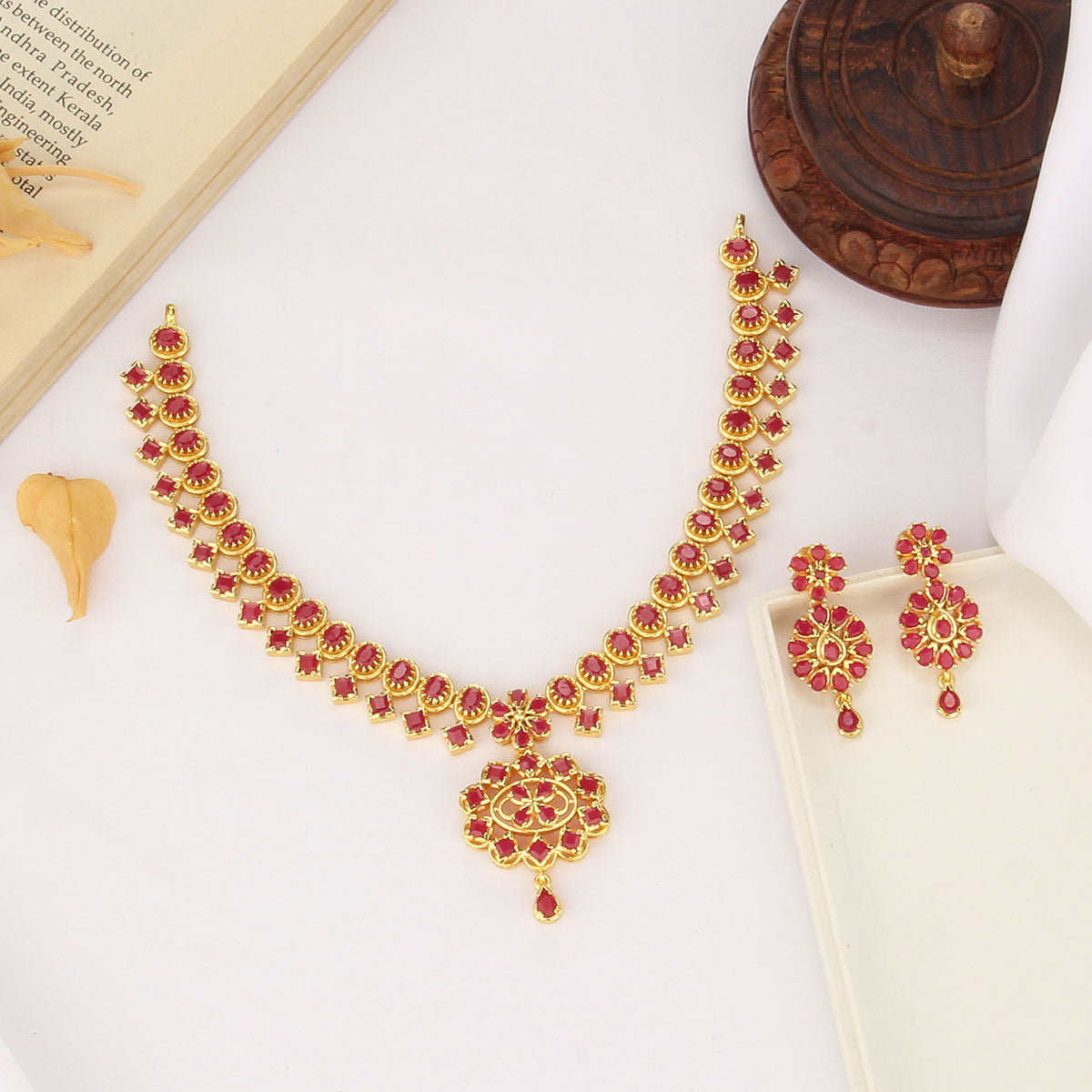 This 92.5 Silver, 24 kt Gold-Plated Short Necklace Set is adorned with Semi-precious Stones for a luxurious aesthetic.