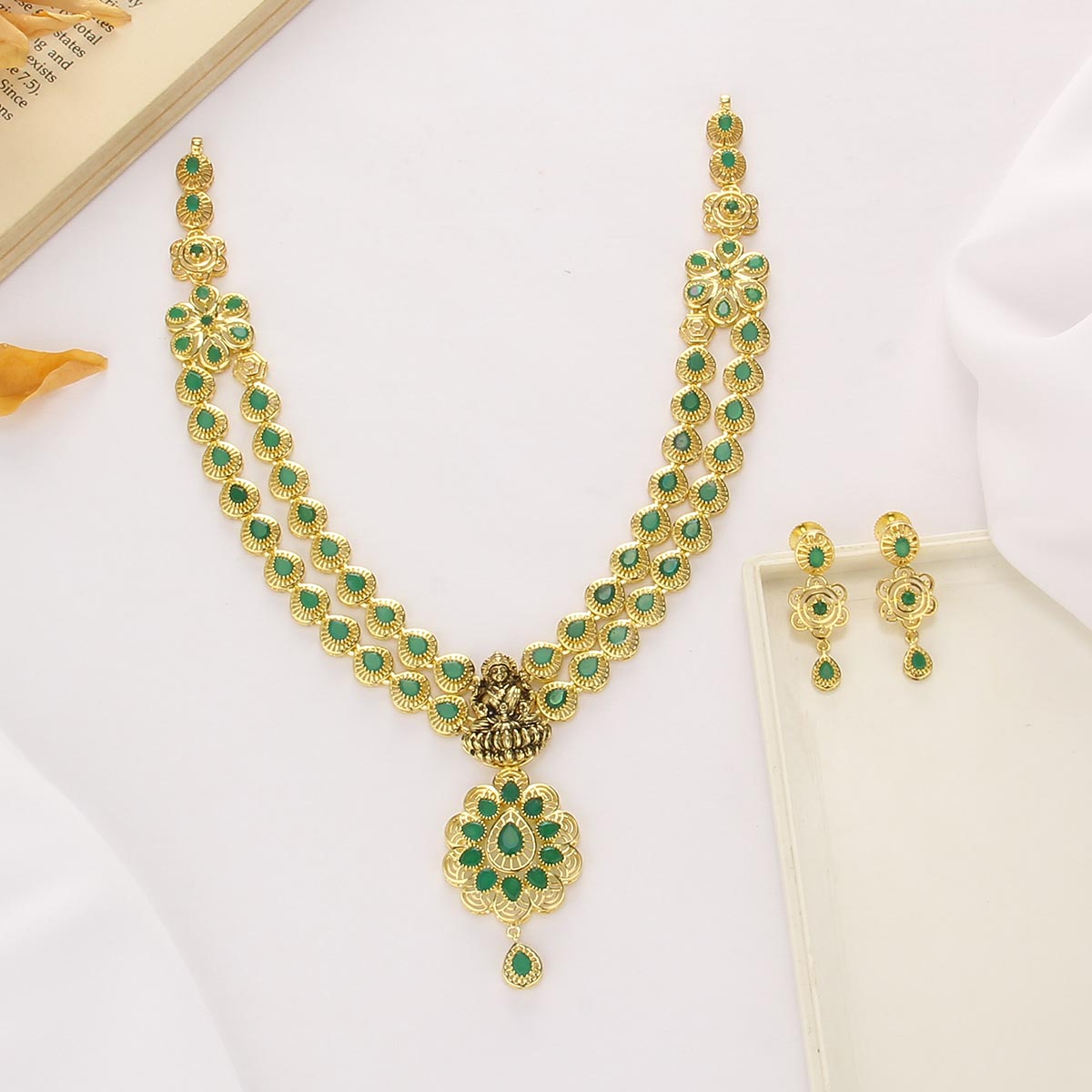 This 92.5 Silver, 24 kt Gold-Plated Short Necklace Set is adorned with Semi-precious Stones for a luxurious aesthetic.