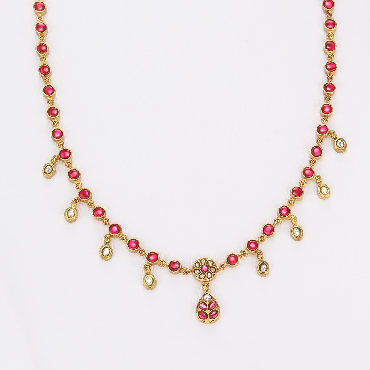 This 92.5 Silver, 24 kt Gold-Plated Necklace is adorned with Semi-precious Kundan Stones for a luxurious aesthetic.