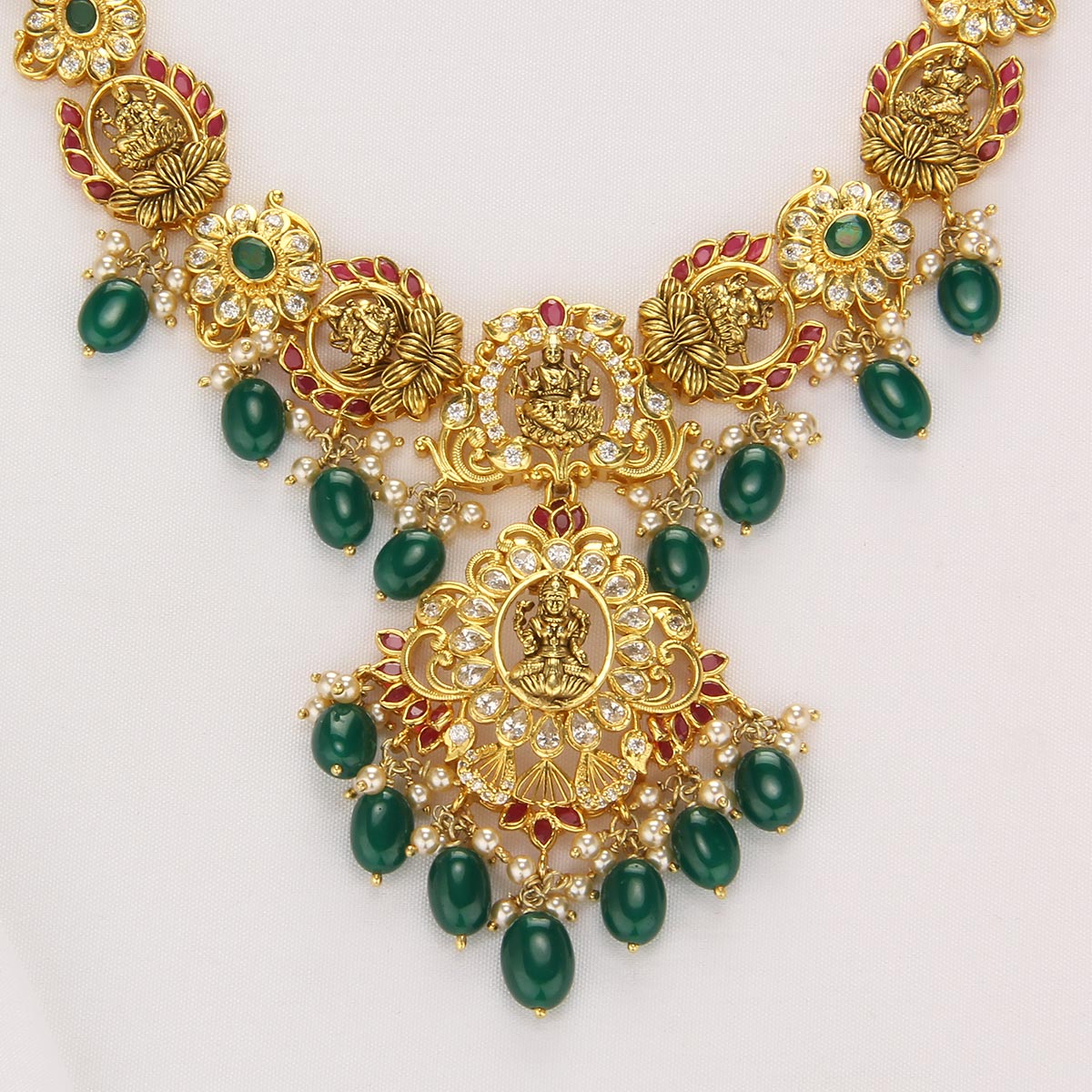 This 92.5 Silver, 24 kt Gold-Plated Short Necklace Set is adorned with Semi-precious Stones for a luxurious aesthetic.