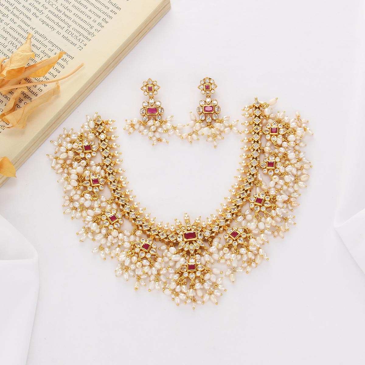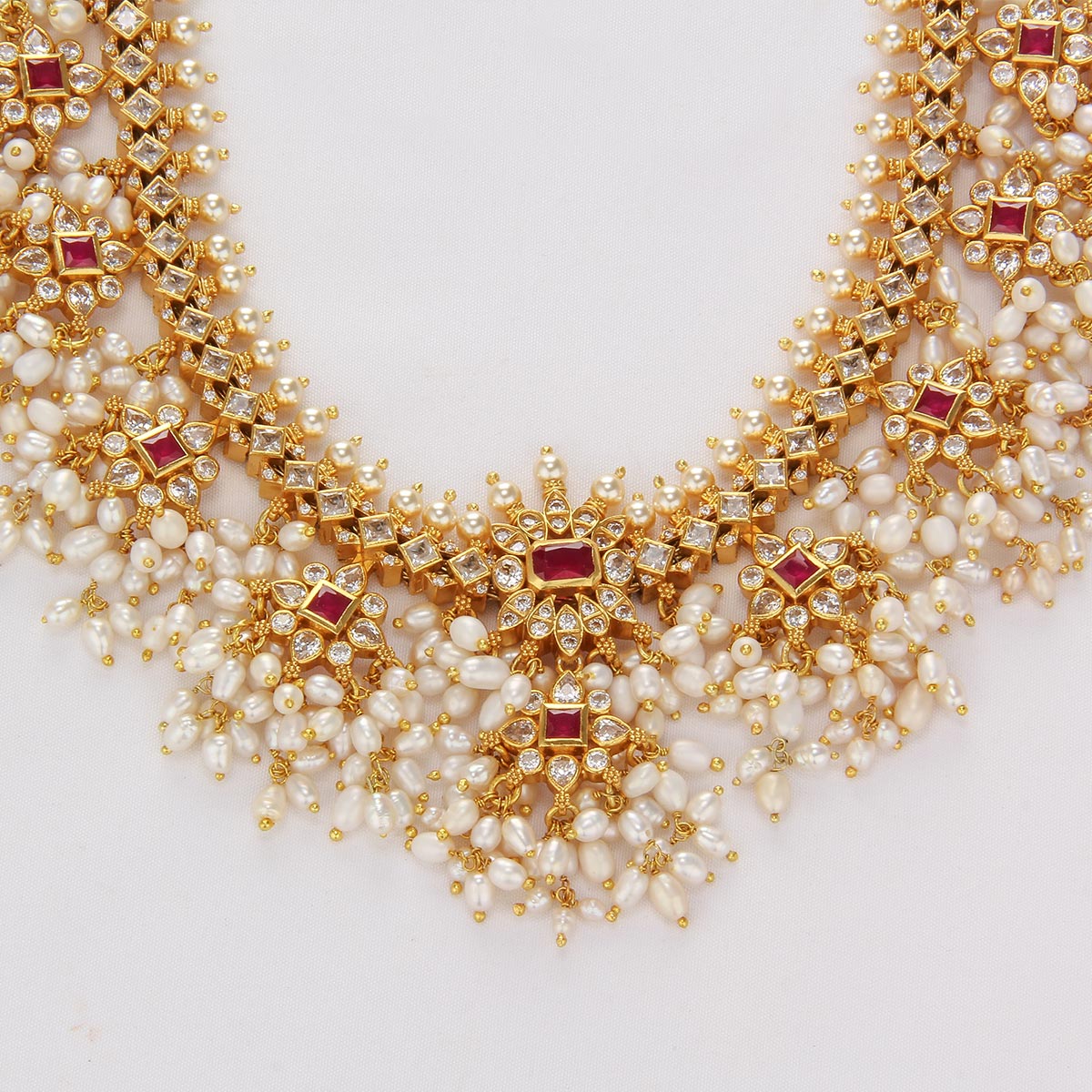 This 92.5 Silver, 24 kt gold-plated stylish Necklace is studded with semi-precious stones to make a stunning statement. Perfect for any special occasion.
