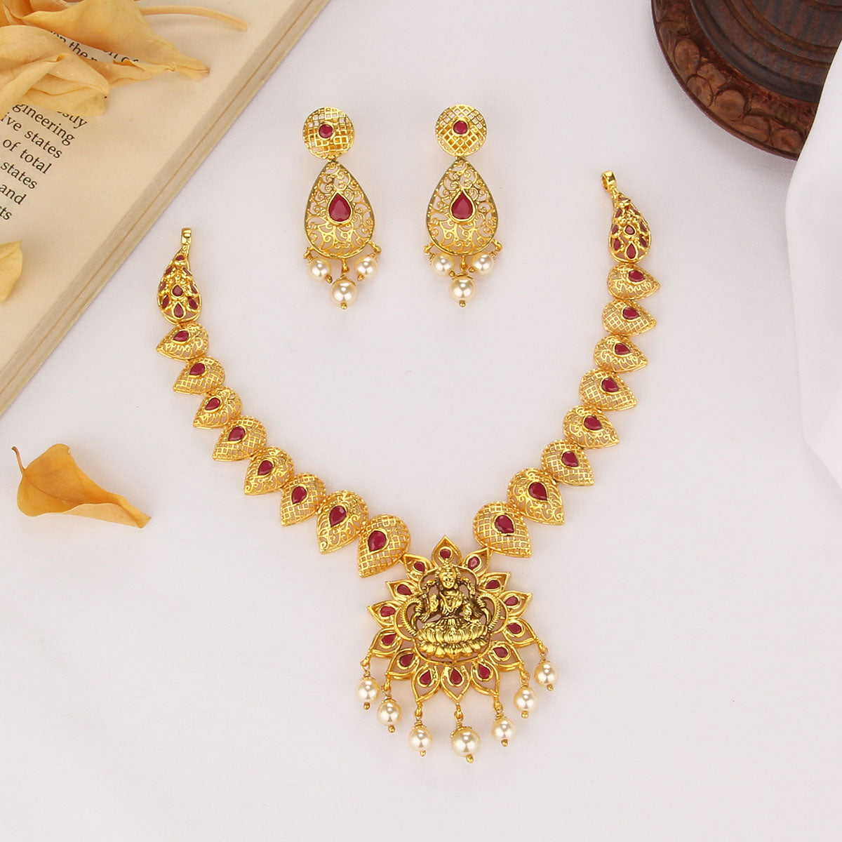 This 92.5 Silver, 24 kt Gold-Plated Short Necklace Set is adorned with Semi-precious Stones for a luxurious aesthetic.