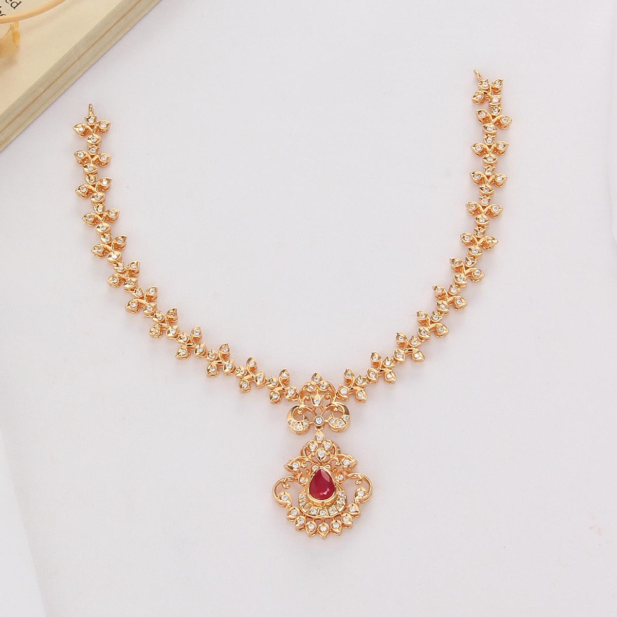 This 92.5 Silver, 24 kt gold-plated, stylish Necklace is studded with semi-precious stones to make a stunning statement. Perfect for any special occasion.