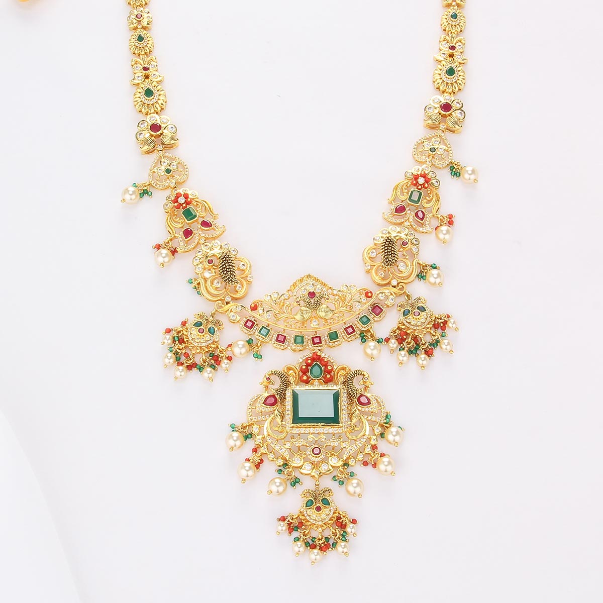 This 92.5 Silver, 24 kt Gold-Plated Long Necklace is adorned with Semi-precious Stones for a luxurious aesthetic.