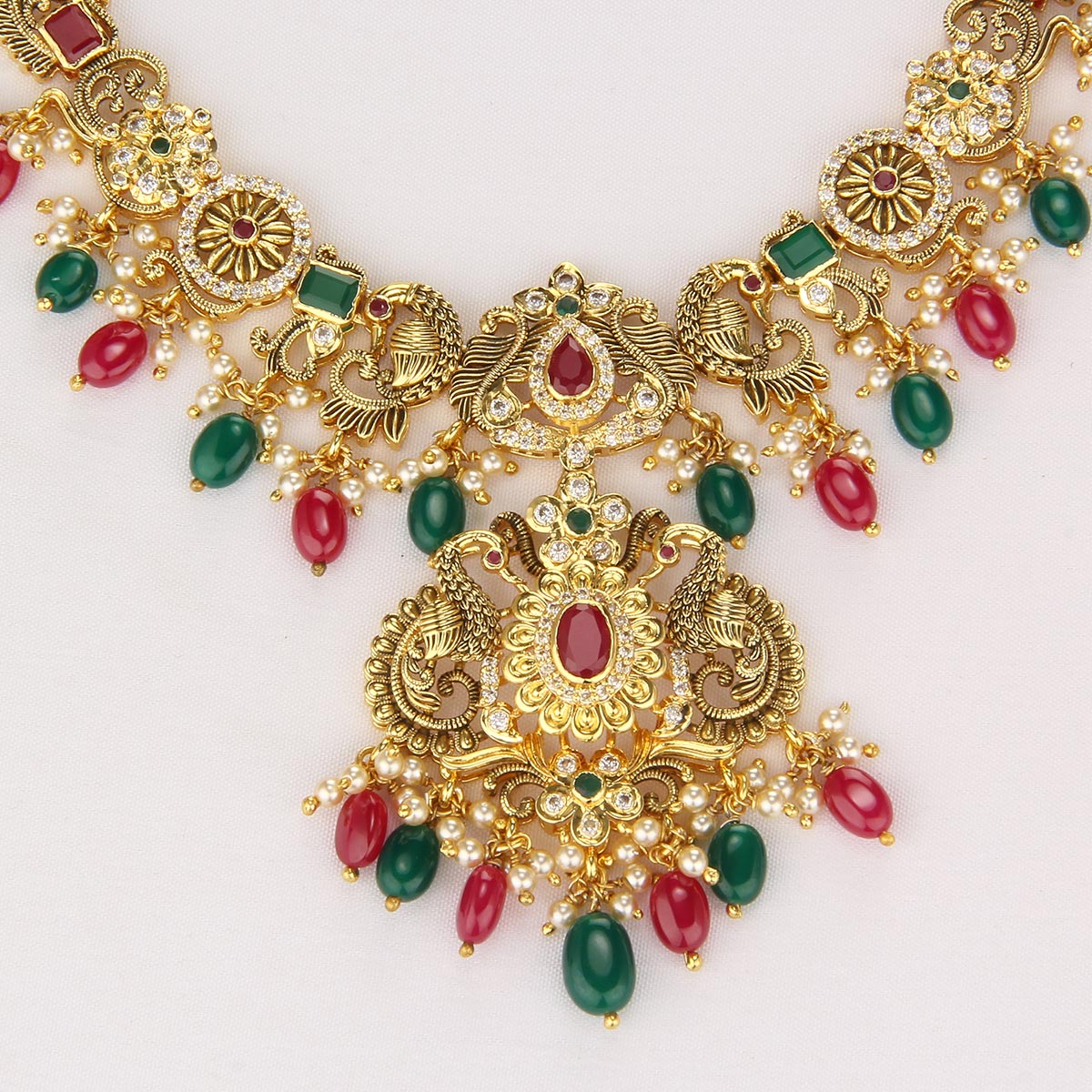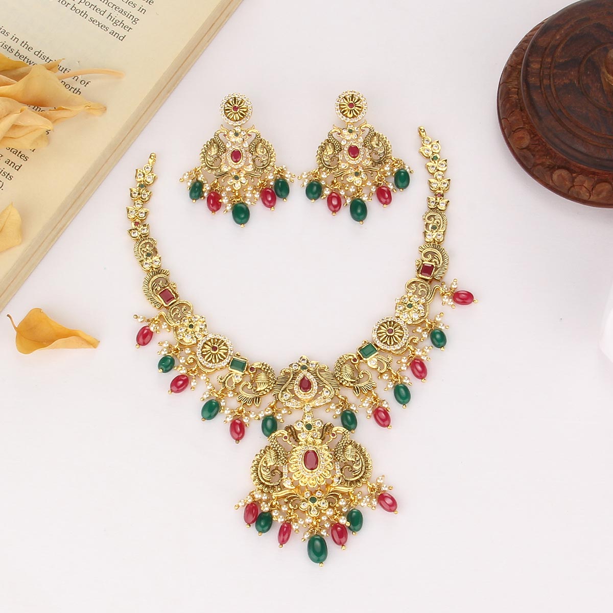 This 92.5 Silver, 24 kt Gold-Plated Short Necklace Set is adorned with Semi-precious Stones for a luxurious aesthetic.
