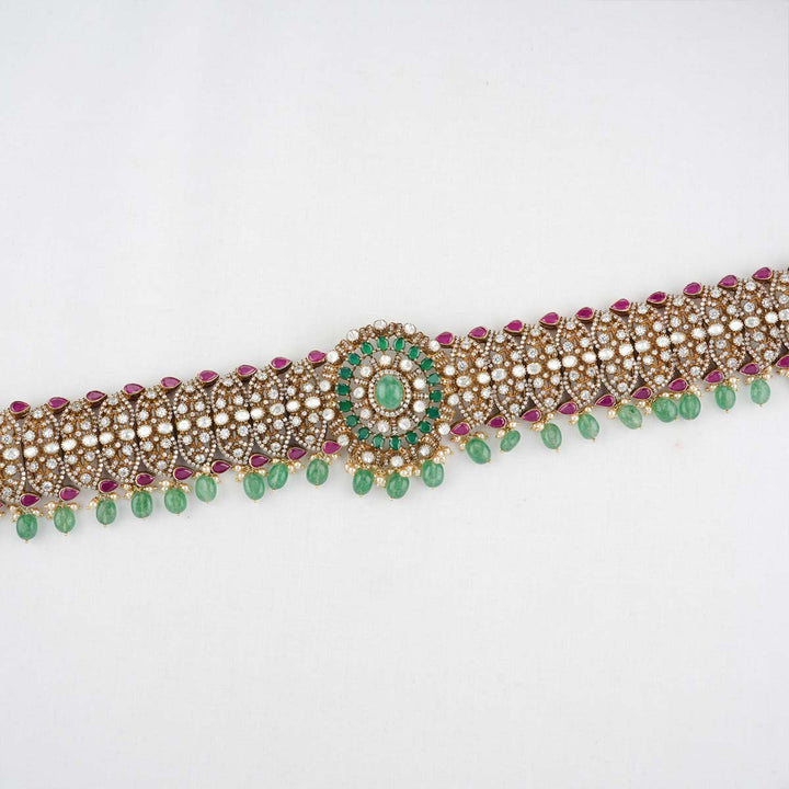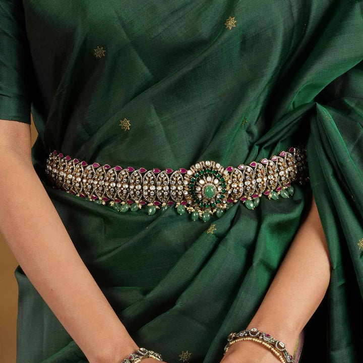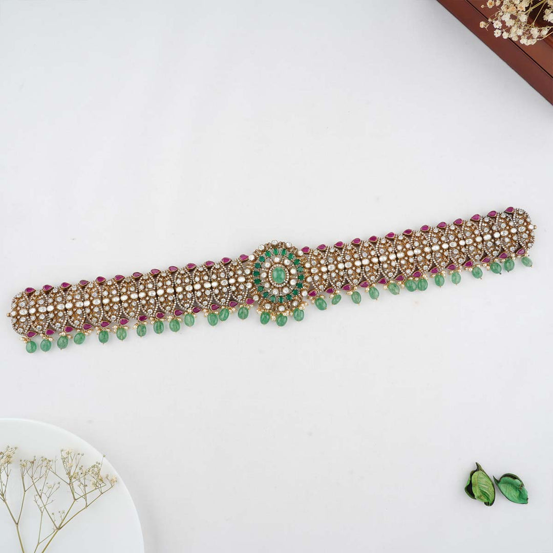92.5 Silver, Victorian Oddiyanam studded with Gem Stones and Pearl Beads.