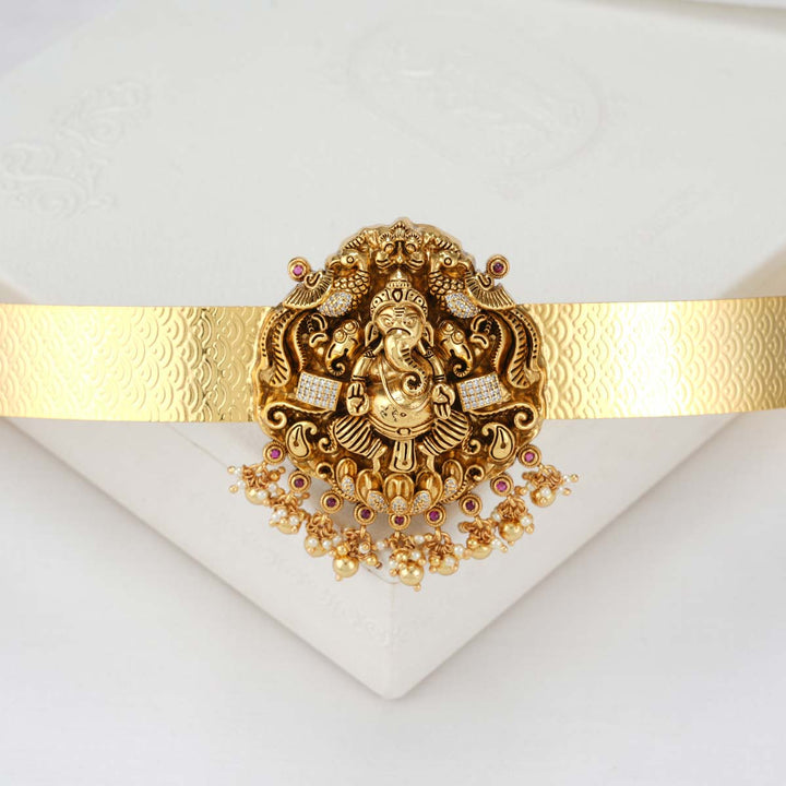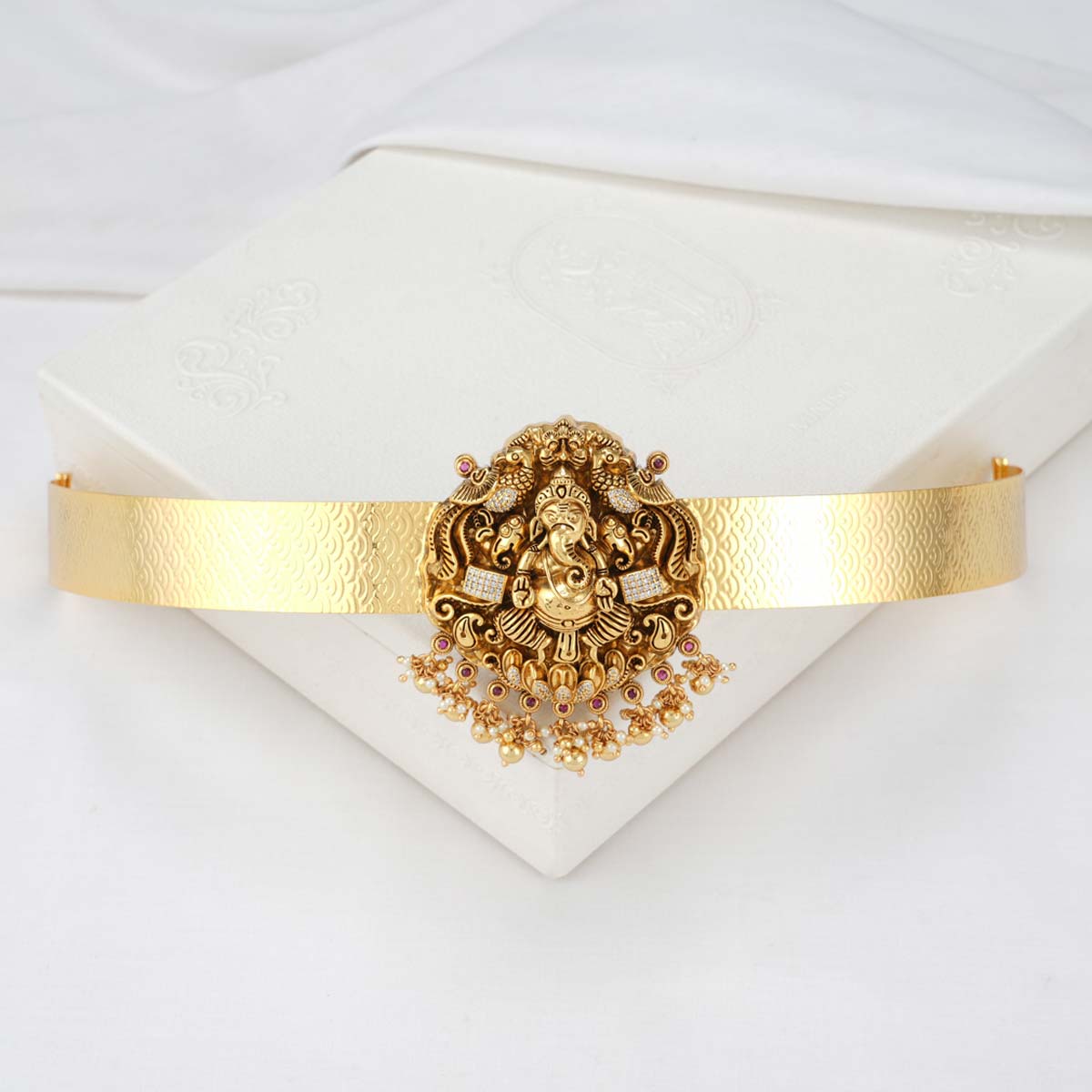 92.5 Silver, gold plated with goodness Lakshmi nagas oddiyanam/vadanam. this is studded with semi-precious stones that cast an auspicious blessing on the bride.