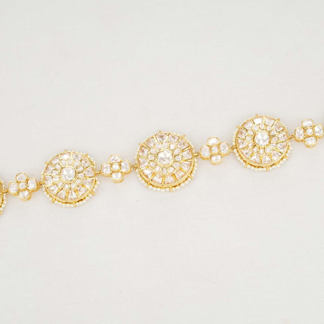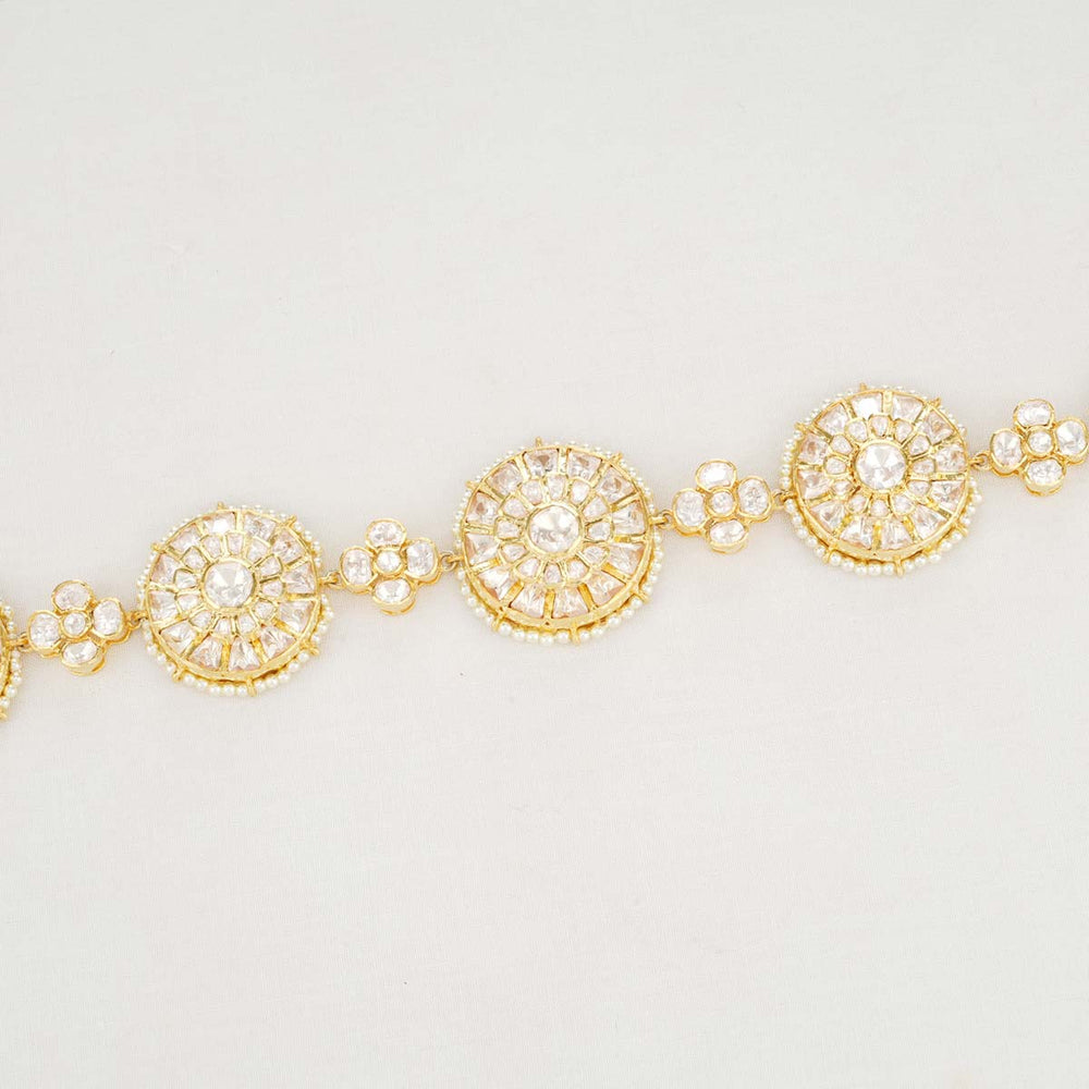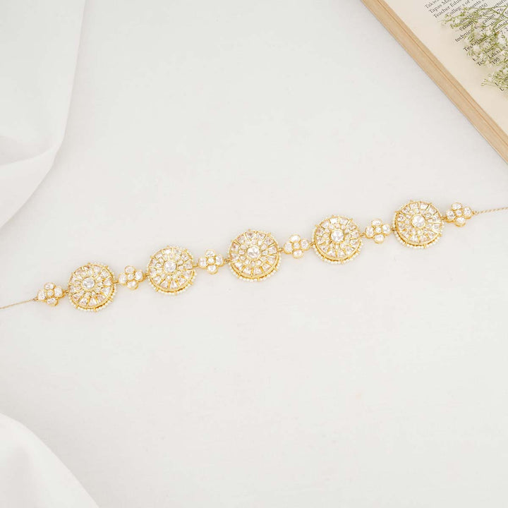 This 92.5 Silver, 24 kt Gold-Plated Sheeshphool is adorned with Semi-precious Stones for a luxurious aesthetic.