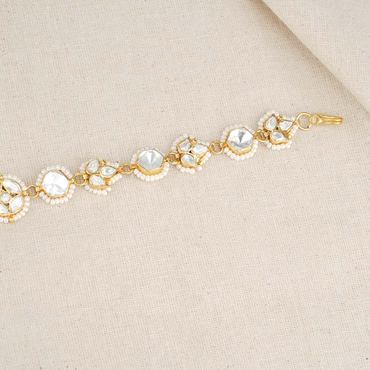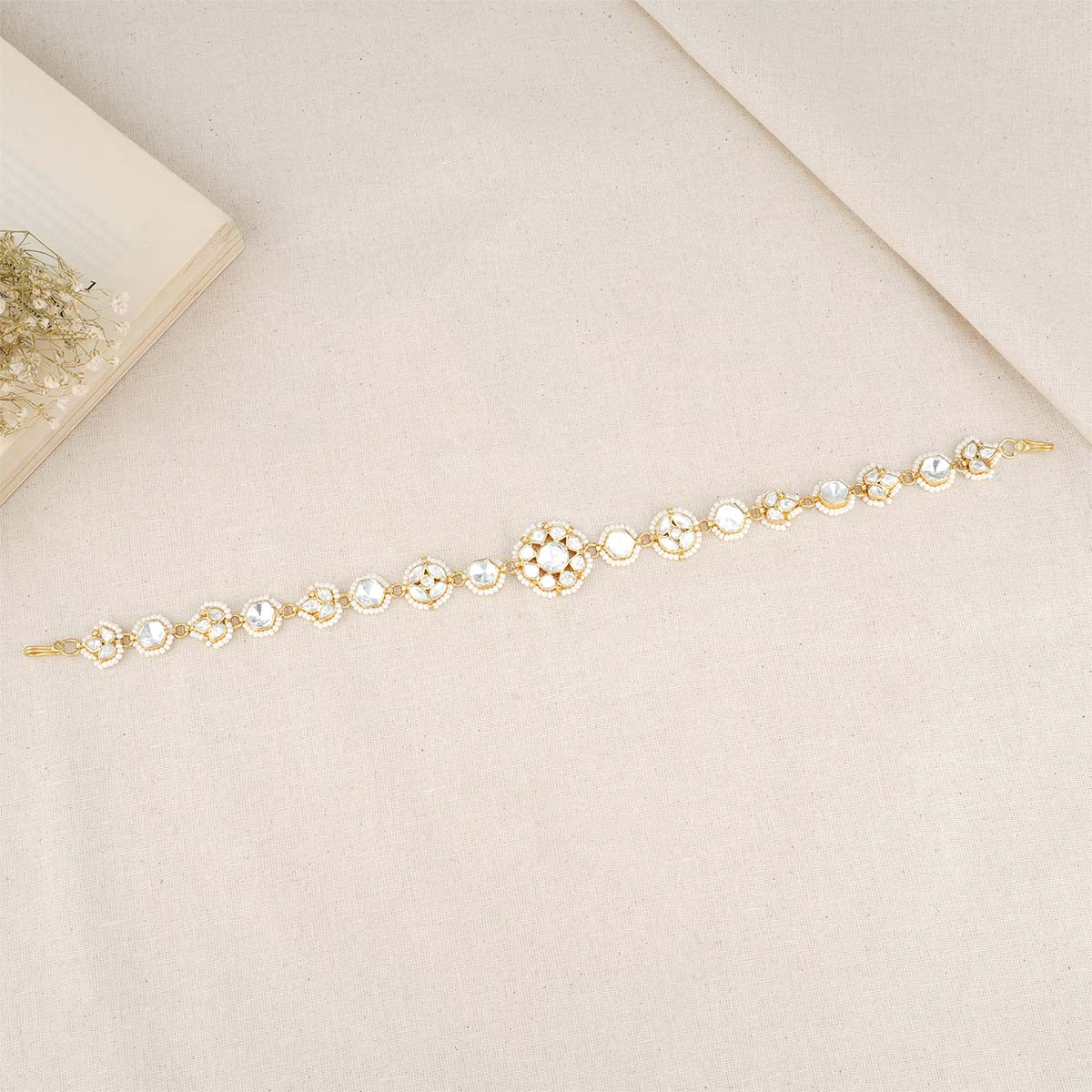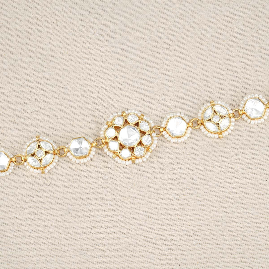 This Delightful Kundan Sheeshphool is crafted with 92.5 Silver and 24Kt Gold Plating and is embellished with Semi-Precious Stones