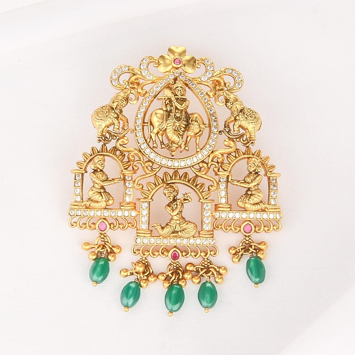 This Nagas Nakshi pendant is handcrafted in 92.5 silver and plated with 24kt gold. It is finely detailed with semi-precious stones, adding a subtle sparkle and perfect finishing touch.