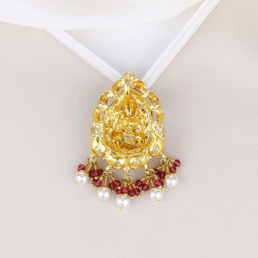 This collection of Lasika Nagas Nakshi pendants is handcrafted in 92.5 silver and plated with 24kt gold. It is finely detailed with semi-precious stones, adding a subtle sparkle and perfect finishing touch.
