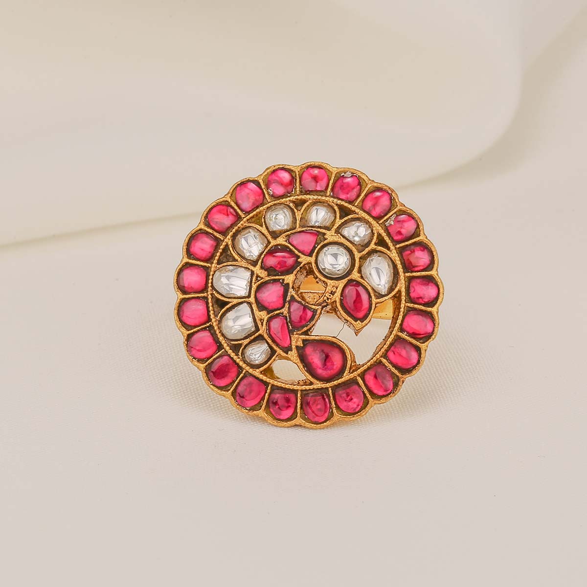 This 92.5 Silver, 24 kt Gold-Plated Ring is adorned with Semi-precious Kundan Stones for a luxurious aesthetic.