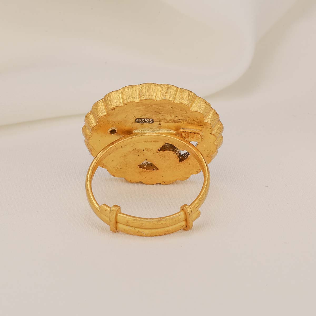 This 92.5 Silver, 24 kt Gold-Plated Ring is adorned with Semi-precious Kundan Stones for a luxurious aesthetic.