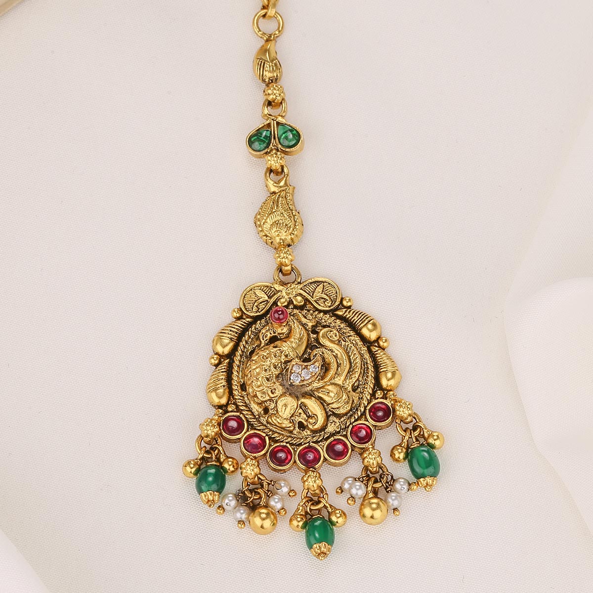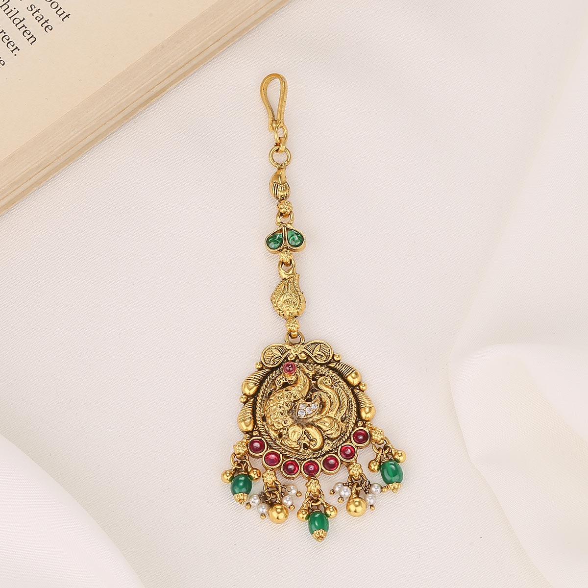 This exquisite Maangtikka will add a glamorous flair to your look. Crafted from 92.5 silver and 24kt gold-plated, it features semi-precious stones for a brilliant shine. Elevate your look with this luxurious Maangtikka.