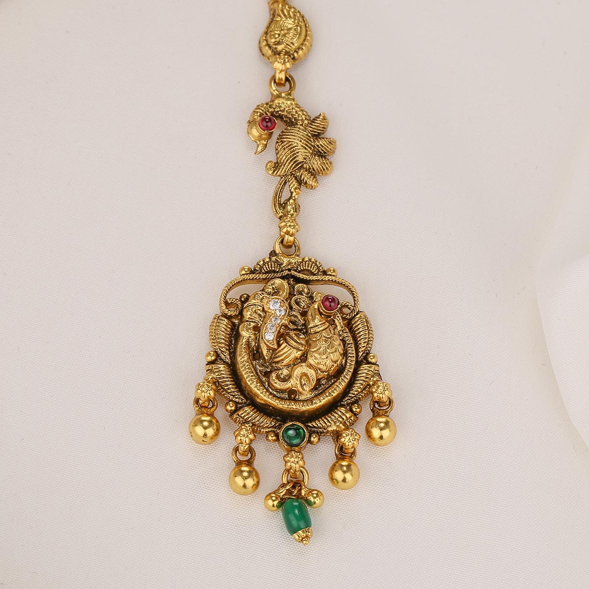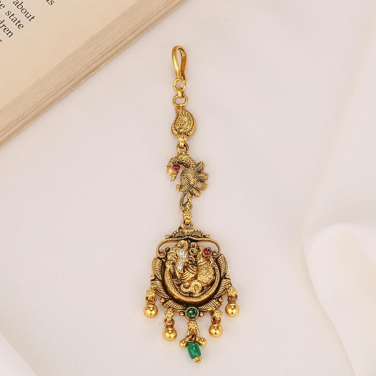 This exquisite Maangtikka will add a glamorous flair to your look. Crafted from 92.5 silver and 24kt gold-plated, it features semi-precious stones for a brilliant shine. Elevate your look with this luxurious Maangtikka.