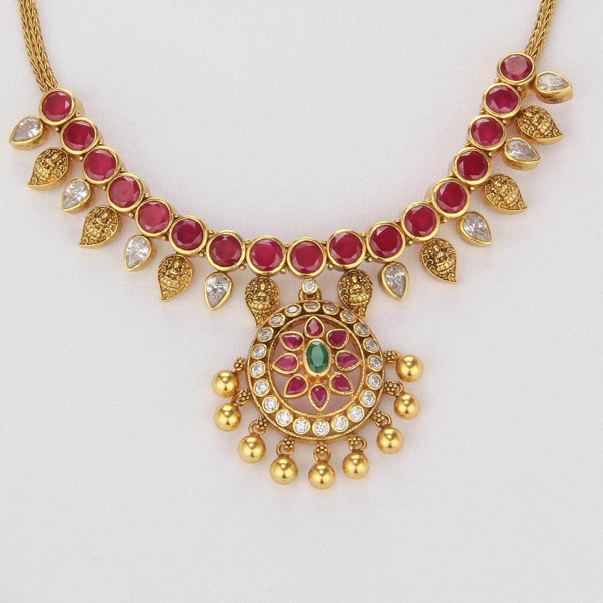 This necklace is crafted from 92.5 Silver and features 24-karat gold plating as well as semiprecious stones.
