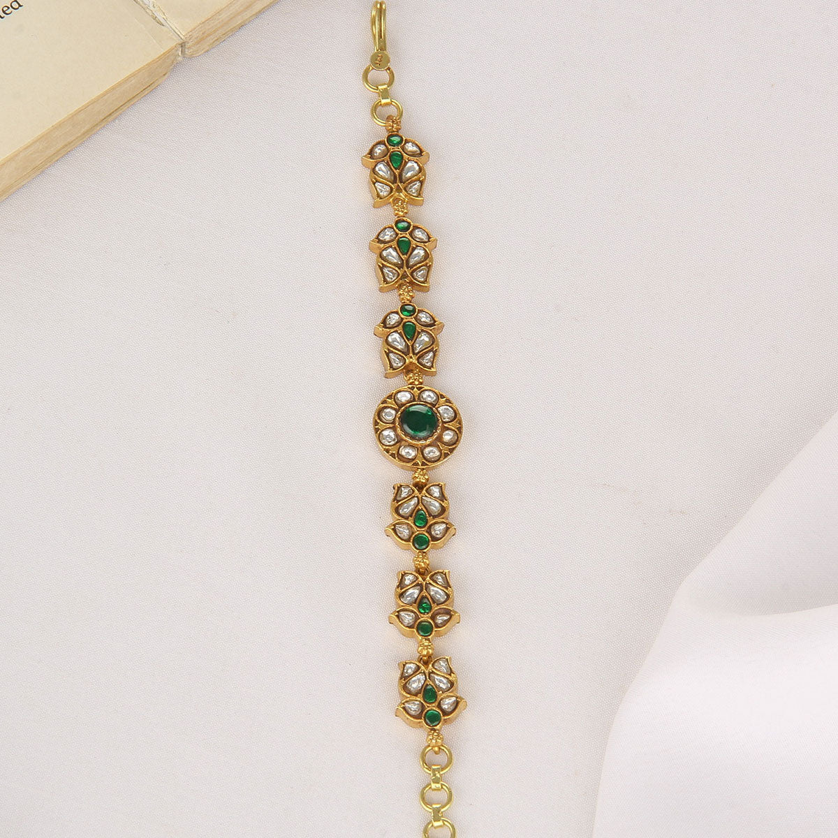 This 92.5 Silver, 24 kt Gold-Plated bracelet is adorned with Semi-precious Kundan Stones for a luxurious aesthetic.