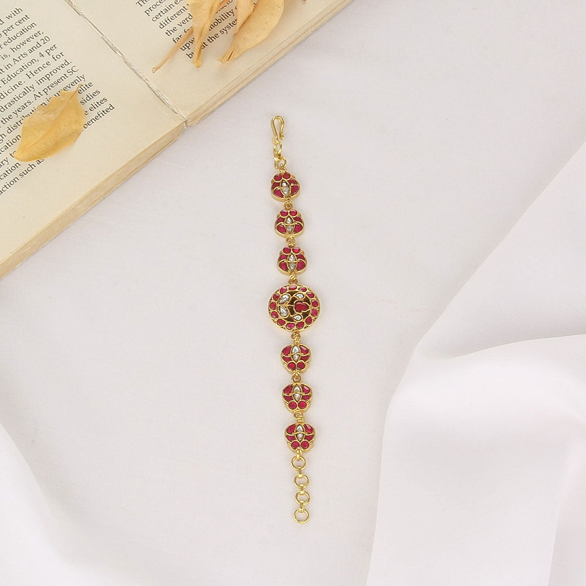 This 92.5 Silver, 24 kt Gold-Plated bracelet is adorned with Semi-precious Kundan Stones for a luxurious aesthetic.