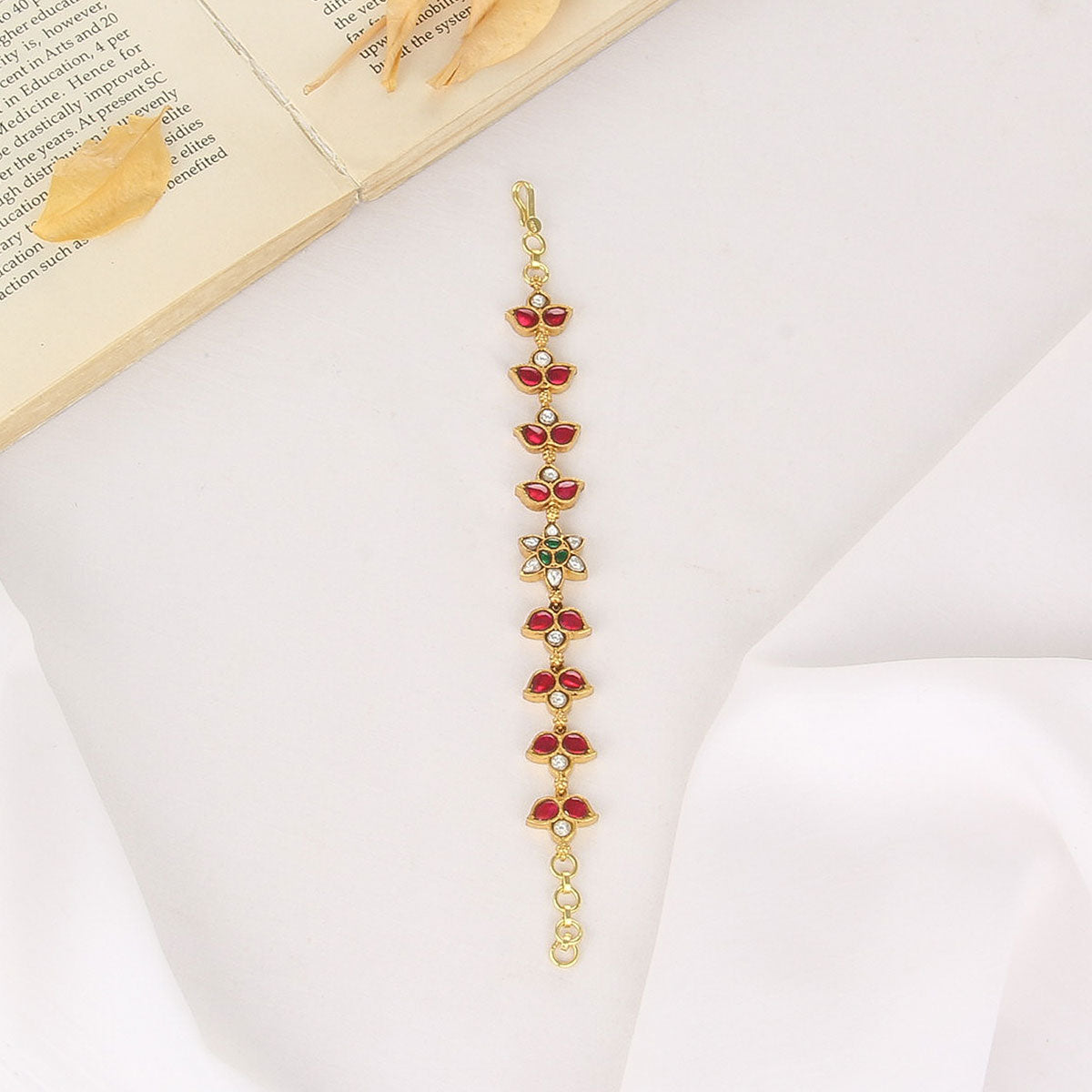This 92.5 Silver, 24 kt Gold-Plated bracelet is adorned with Semi-precious Kundan Stones for a luxurious aesthetic.