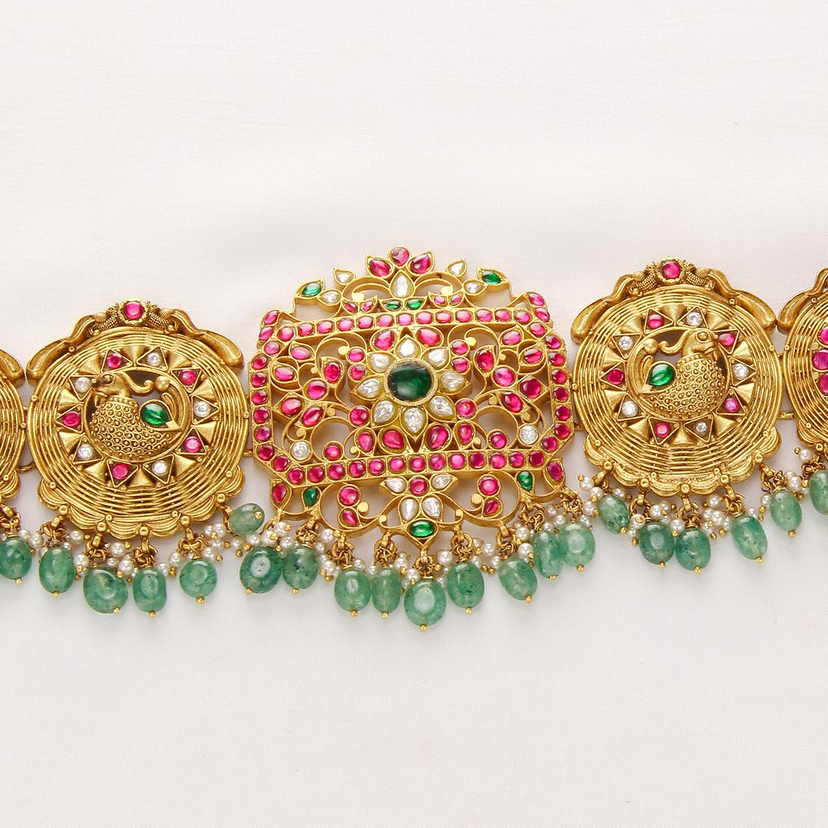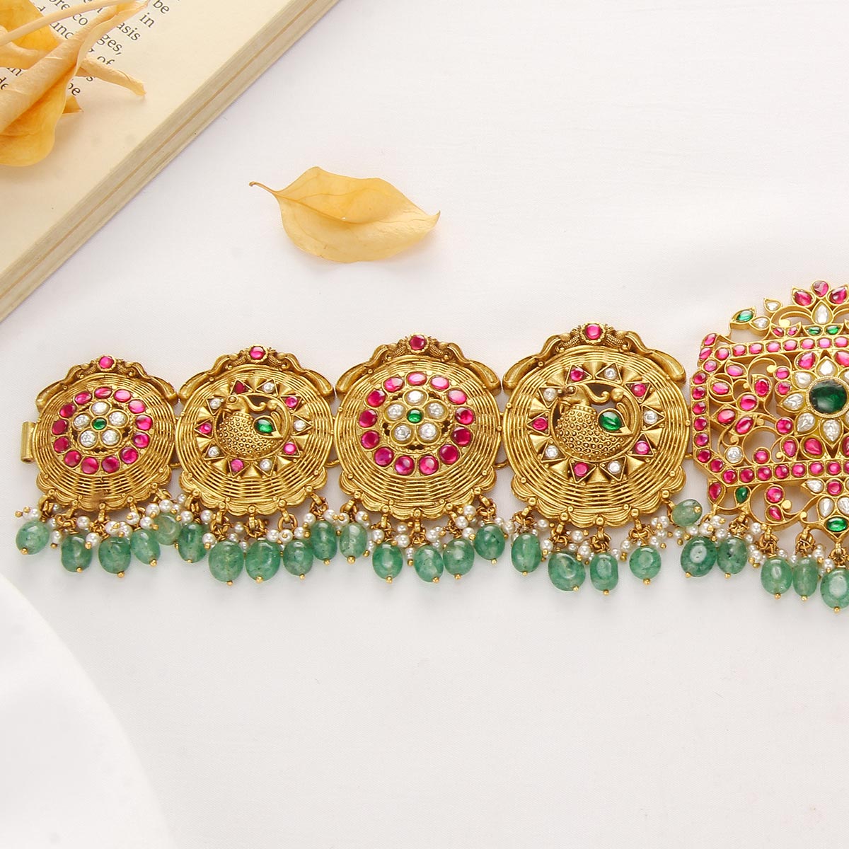 92.5 gold plated nagas oddiyanam/vadanam. This is studded with  Semi-Precious stones that cast an auspicious blessing on the bride.