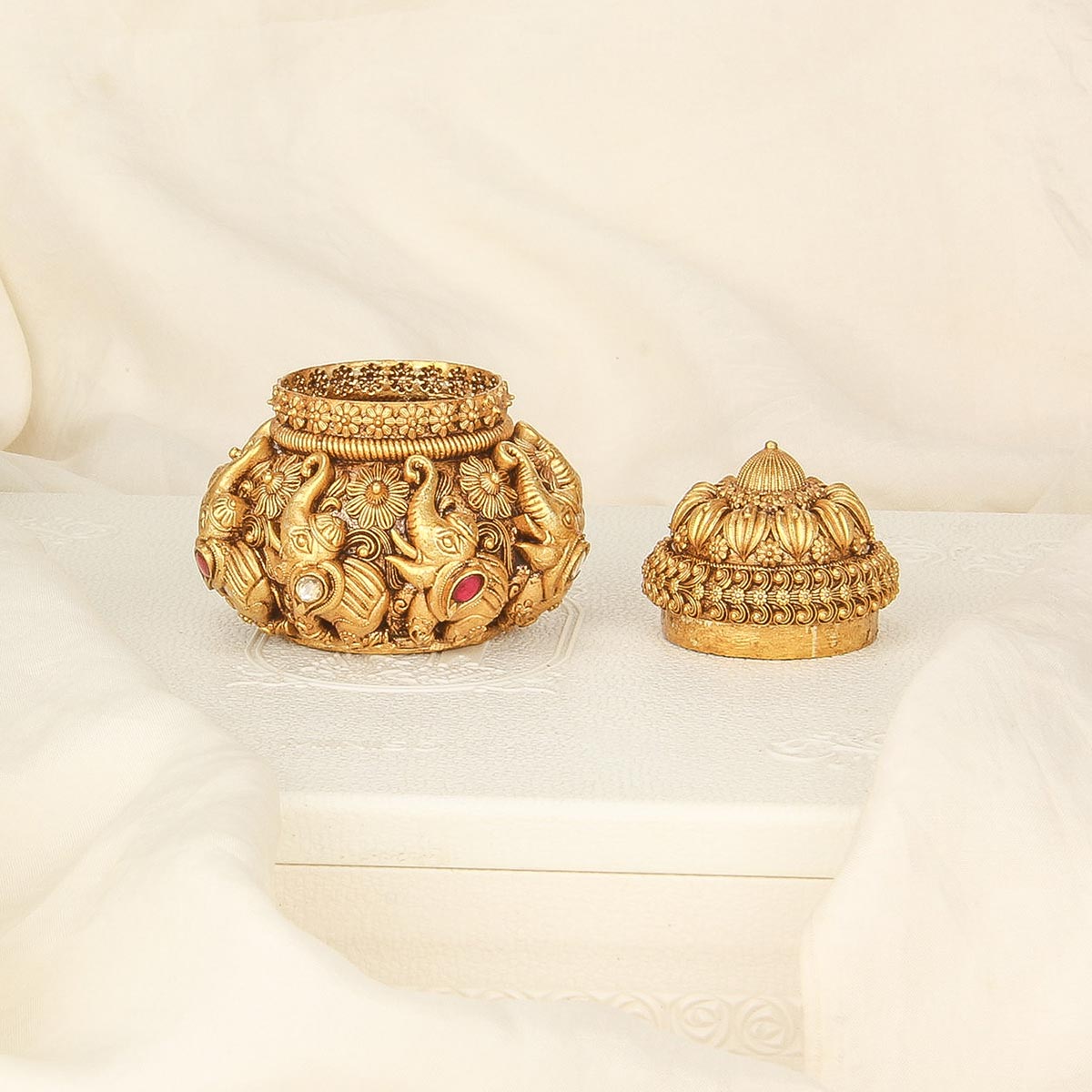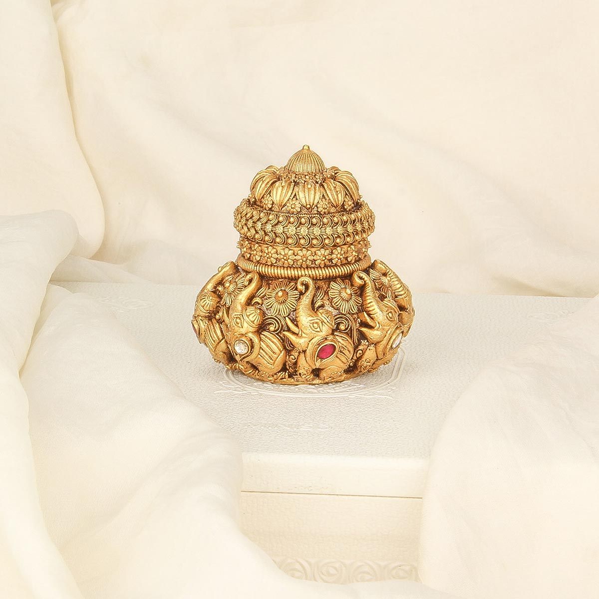 This beautiful Kum Kum Box is a timeless sophistication to any household. Crafted from 92.5 Silver, 24 kt Gold Plated the intricate design is inspired by traditional Indian art, featuring unique patterns and details. Perfect for any style of home!