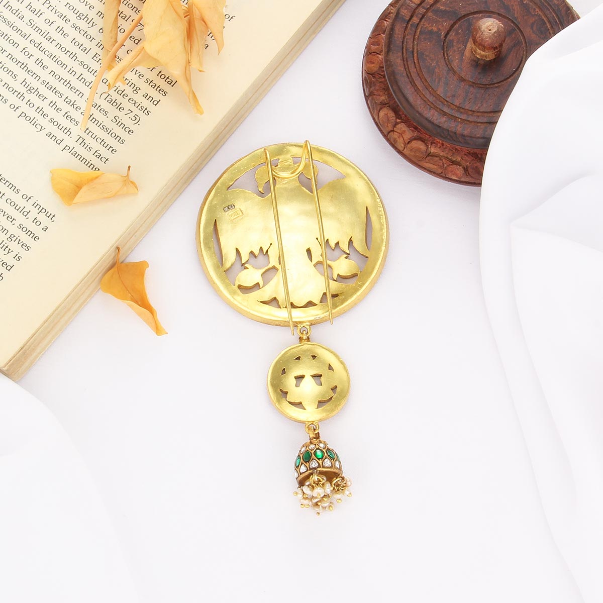 This 92.5 Silver, 24 kt Gold-Plated Jada Billa is adorned with Semi-precious Kundan Stones for a luxurious aesthetic.