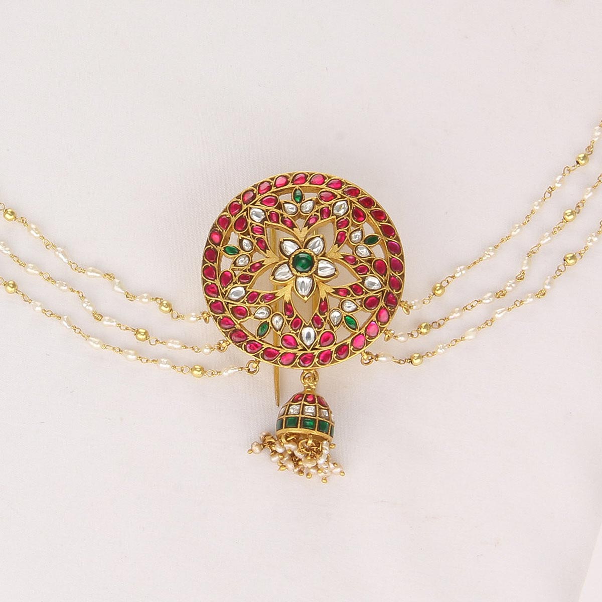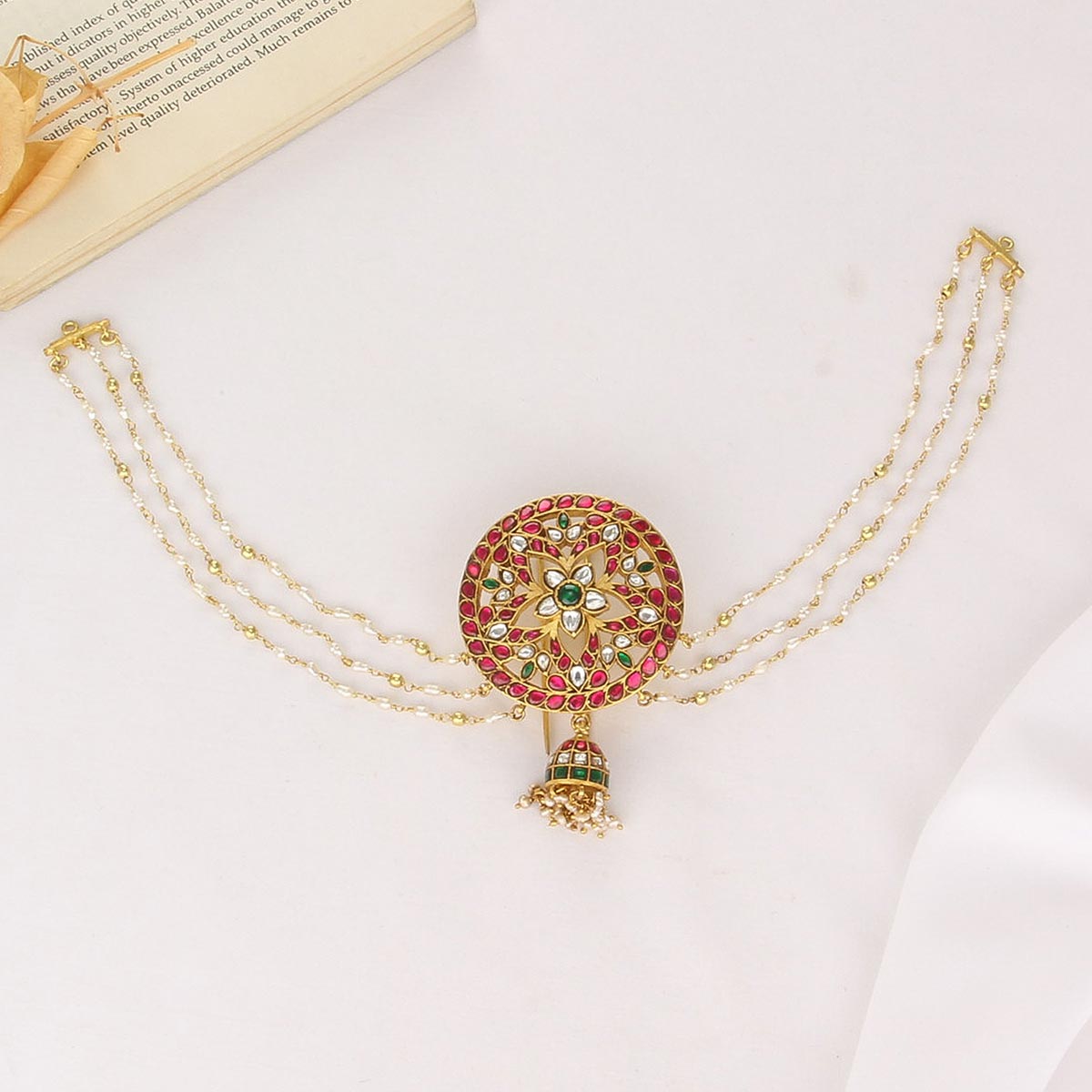 This 92.5 Silver, 24 kt Gold Plated Bridal Jada billa with maatal wedding Hair accessories adorned with Semi-precious Kundan Stones for a luxurious aesthetic.