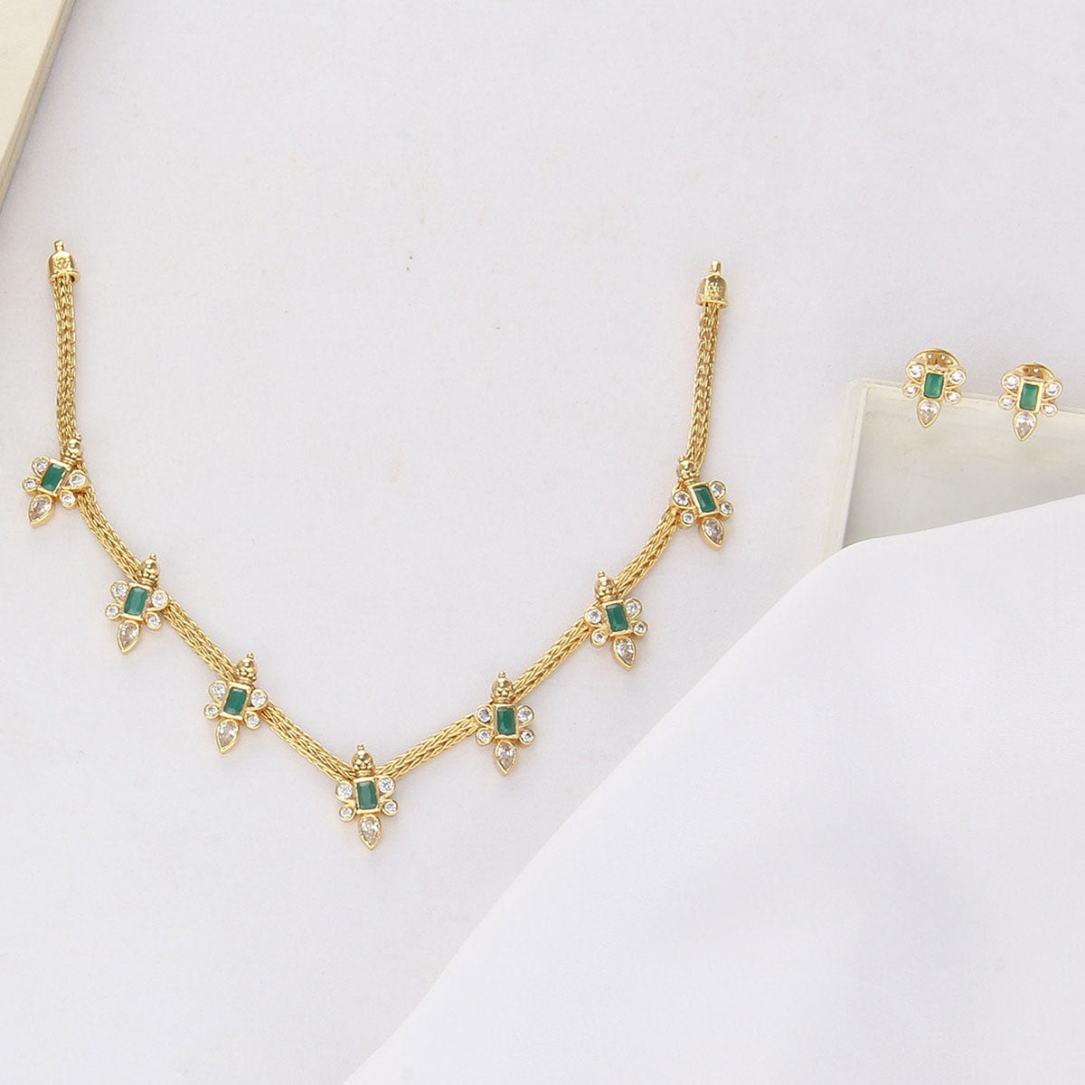 This necklace set is crafted from 92.5 Sterling Silver and features 24-karat gold plating and semiprecious stones.