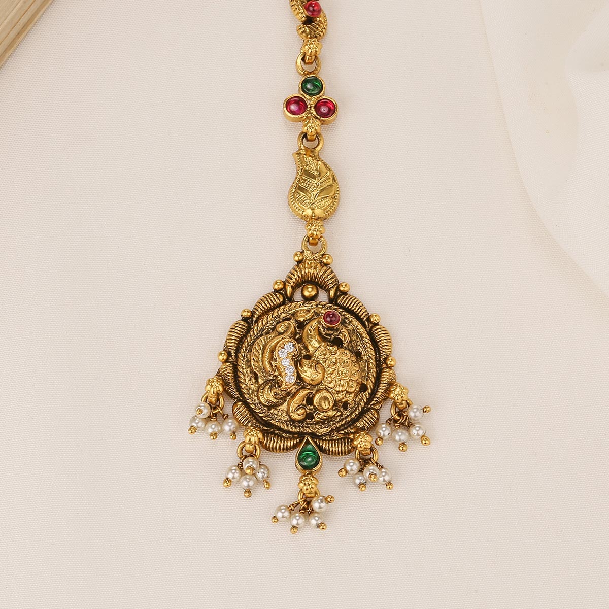 This exquisite Maangtikka will add a glamorous flair to your look. Crafted from 92.5 silver and 24kt gold-plated, it features semi-precious stones for a brilliant shine. Elevate your look with this luxurious Maangtikka.