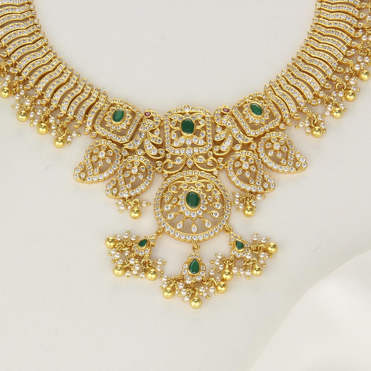 This 92.5 Silver, 24kt gold-plated, stylish Necklace is studded with semi-precious stones to make a stunning statement. Perfect for any special occasion.