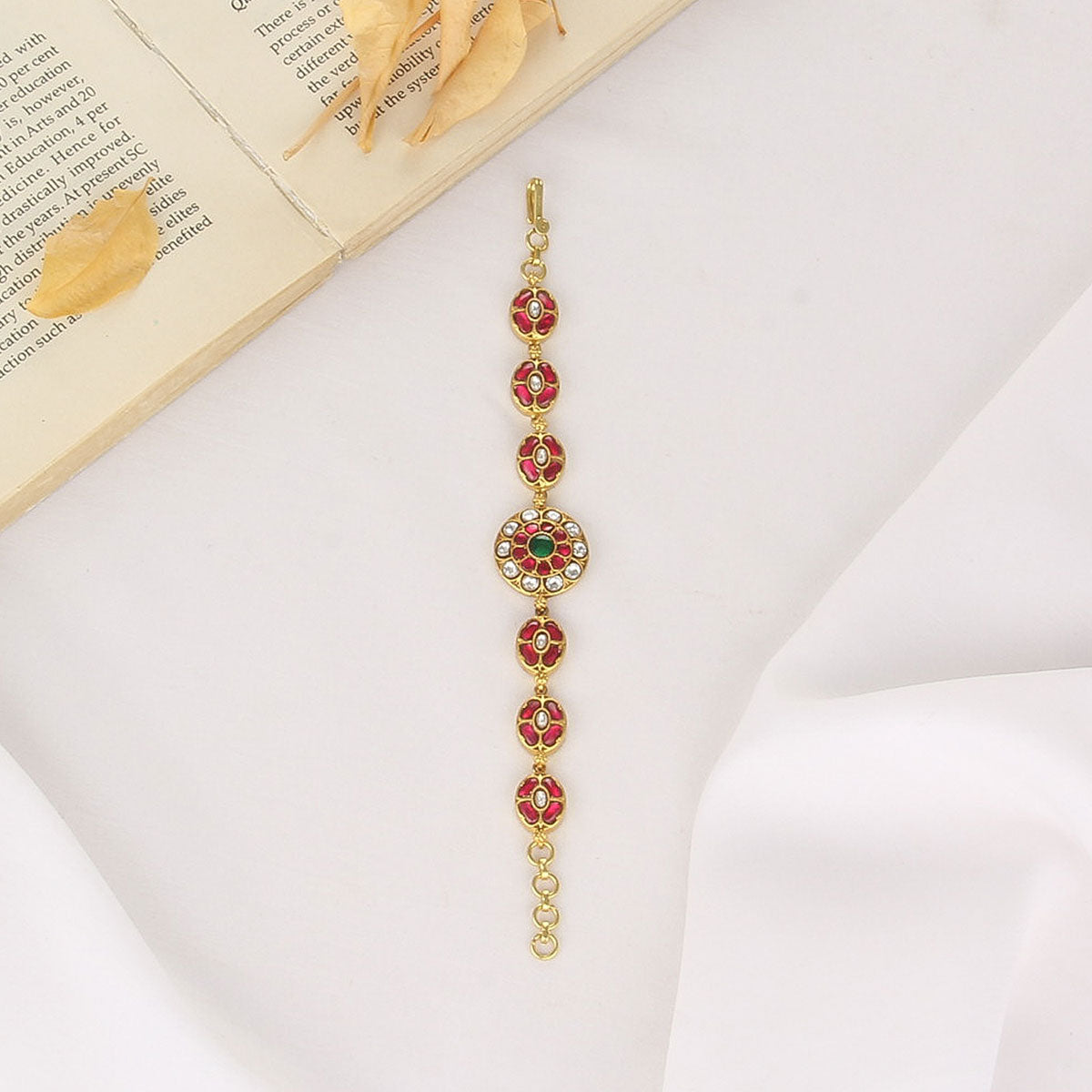 This 92.5 Silver, 24 kt Gold-Plated bracelet is adorned with Semi-precious Kundan Stones for a luxurious aesthetic.