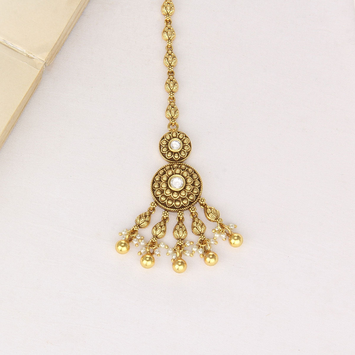 This exquisite Maangtikka will add a glamorous flair to your look. Crafted from 92.5 silver and 24kt gold-plated, it features semi-precious stones for a brilliant shine. Elevate your look with this luxurious Maangtikka.