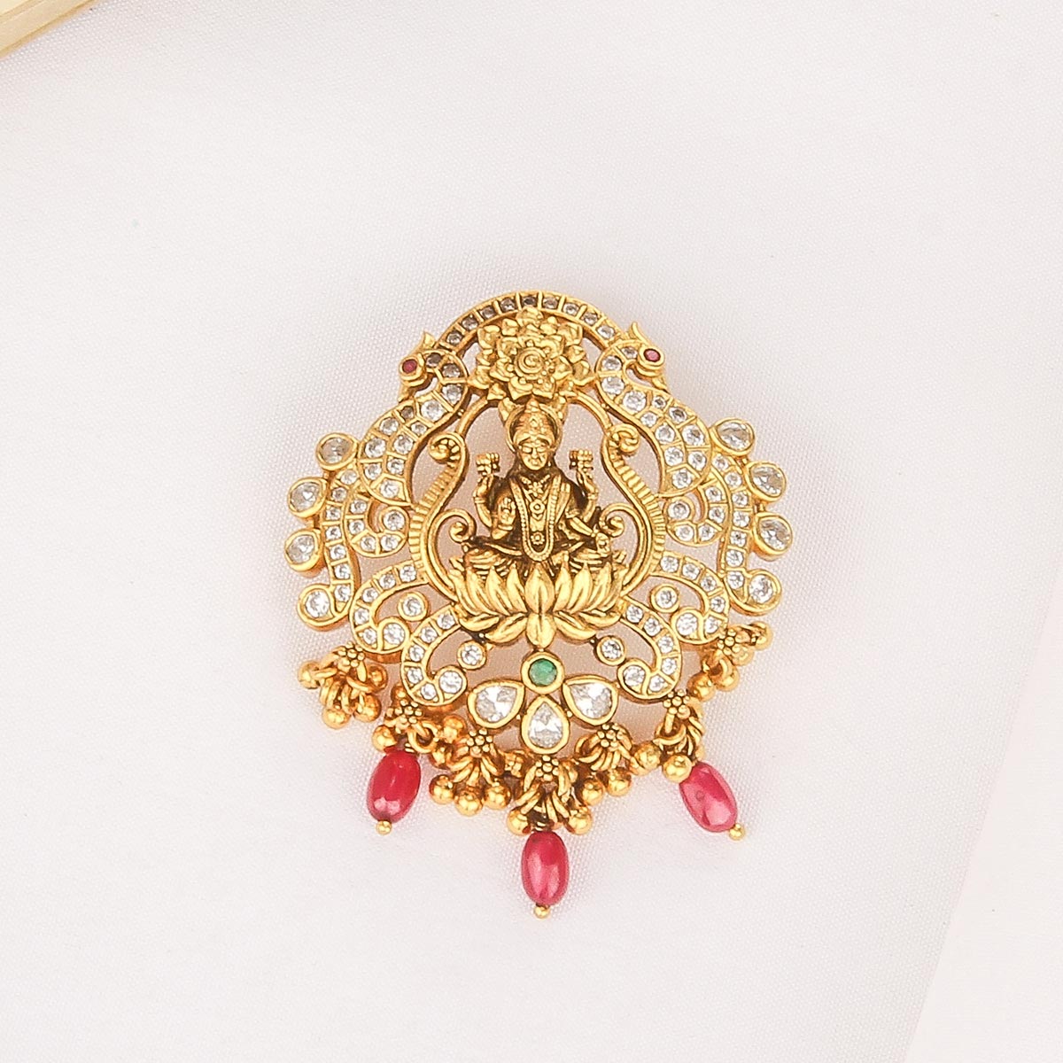 This Nagas Nakshi pendant is handcrafted in 92.5 silver and plated with 24kt gold. It is finely detailed with semi-precious stones, adding a subtle sparkle and perfect finishing touch.