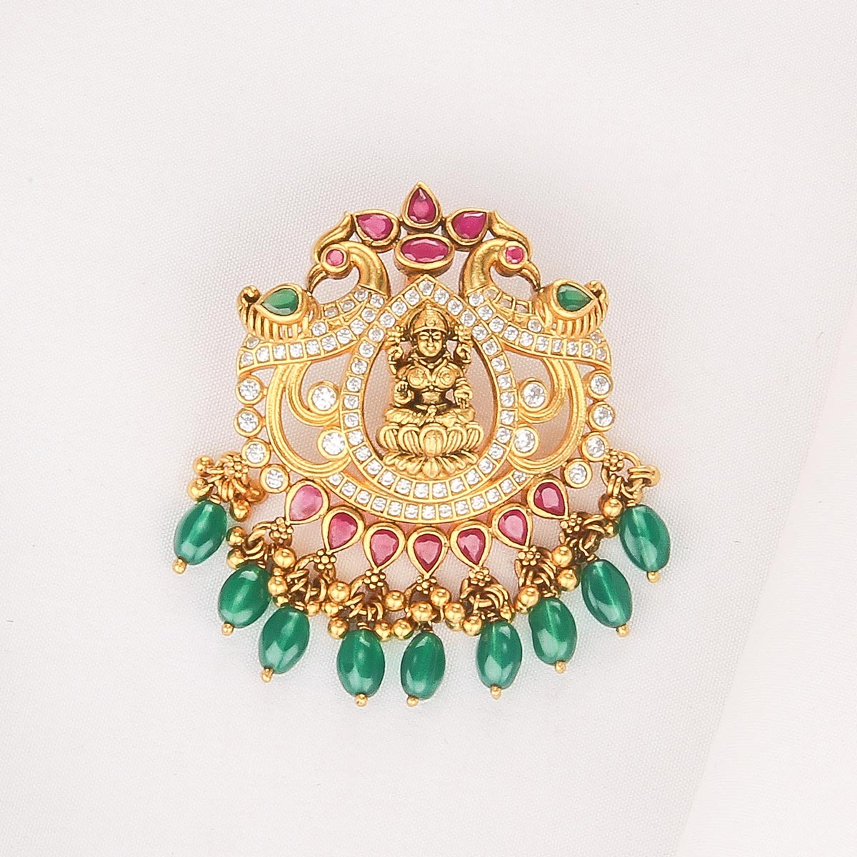 This Nagas Nakshi pendant is handcrafted in 92.5 silver and plated with 24kt gold. It is finely detailed with semi-precious stones , adding a subtle sparkle and perfect finishing touch.