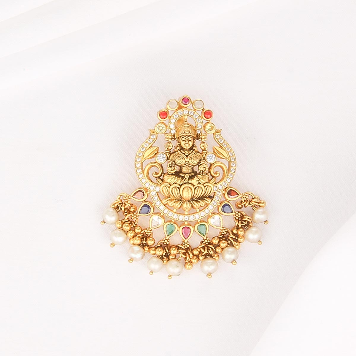 This Nagas Nakshi pendant is handcrafted in 92.5 silver and plated with 24kt gold. It is finely detailed with semi-precious stones, adding a subtle sparkle and perfect finishing touch.