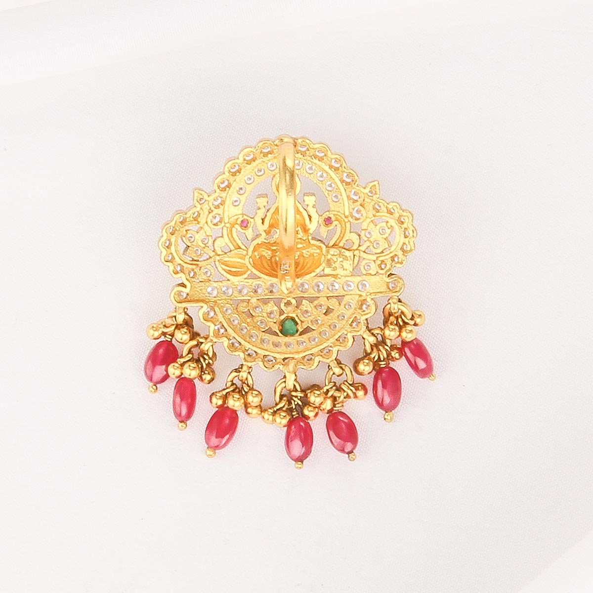 This Nagas Nakshi pendant is handcrafted in 92.5 silver and plated with 24kt gold. It is finely detailed with semi-precious stones, adding a subtle sparkle and perfect finishing touch.