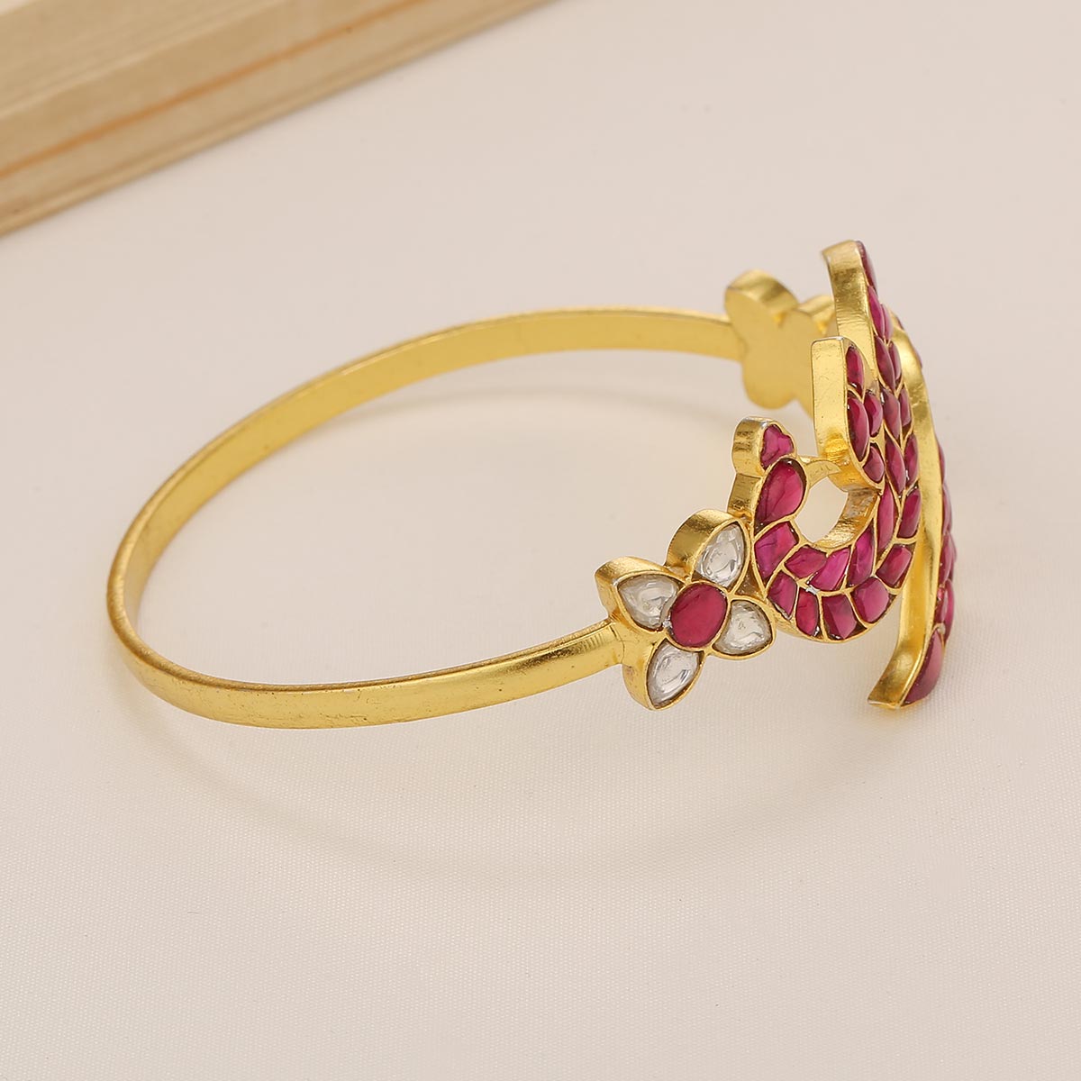 This 92.5 Silver, 24 kt Gold-Plated bracelet is adorned with Semi-precious Kundan Stones for a luxurious aesthetic.