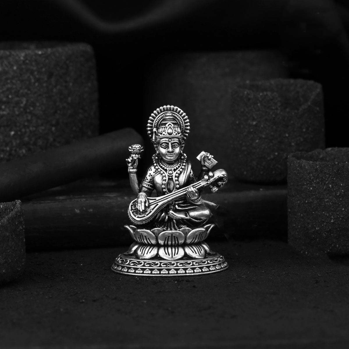 This idol was made from 92.5 silver sits on a Lotus that serves to hold it and highlight its beauty, Saraswati, goddess of knowledge and the arts, embodies the wisdom of Devi. She is the river of consciousness that enlivens creation; she is the dawn-goddess whose rays dispel the darkness of ignorance.