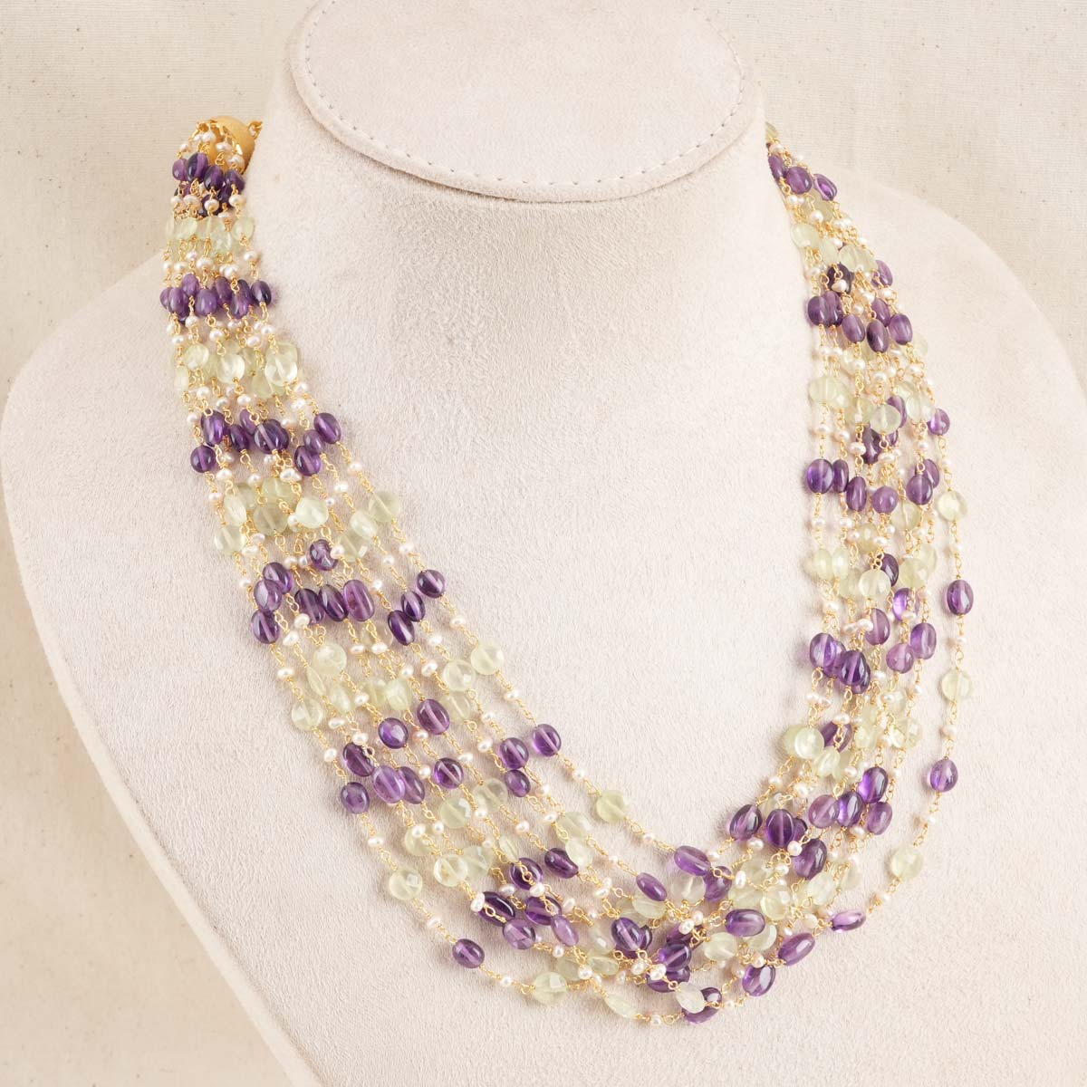 The Necklace/chain has real precious and natural beads and is stung on 92.5 gold-plated silver.