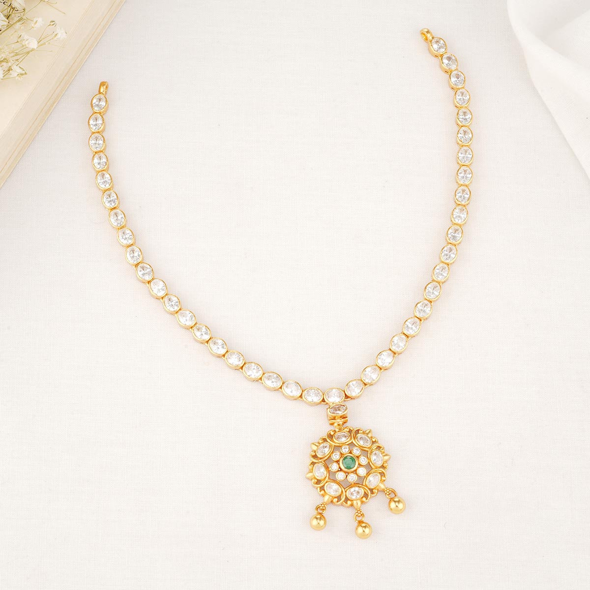 This 92.5 Silver, 24 kt gold-plated stylish Necklace is studded with semi-precious stones to make a stunning statement. Perfect for any special occasion.