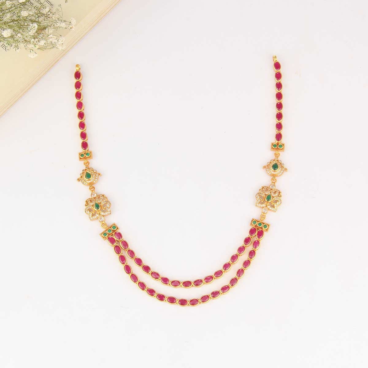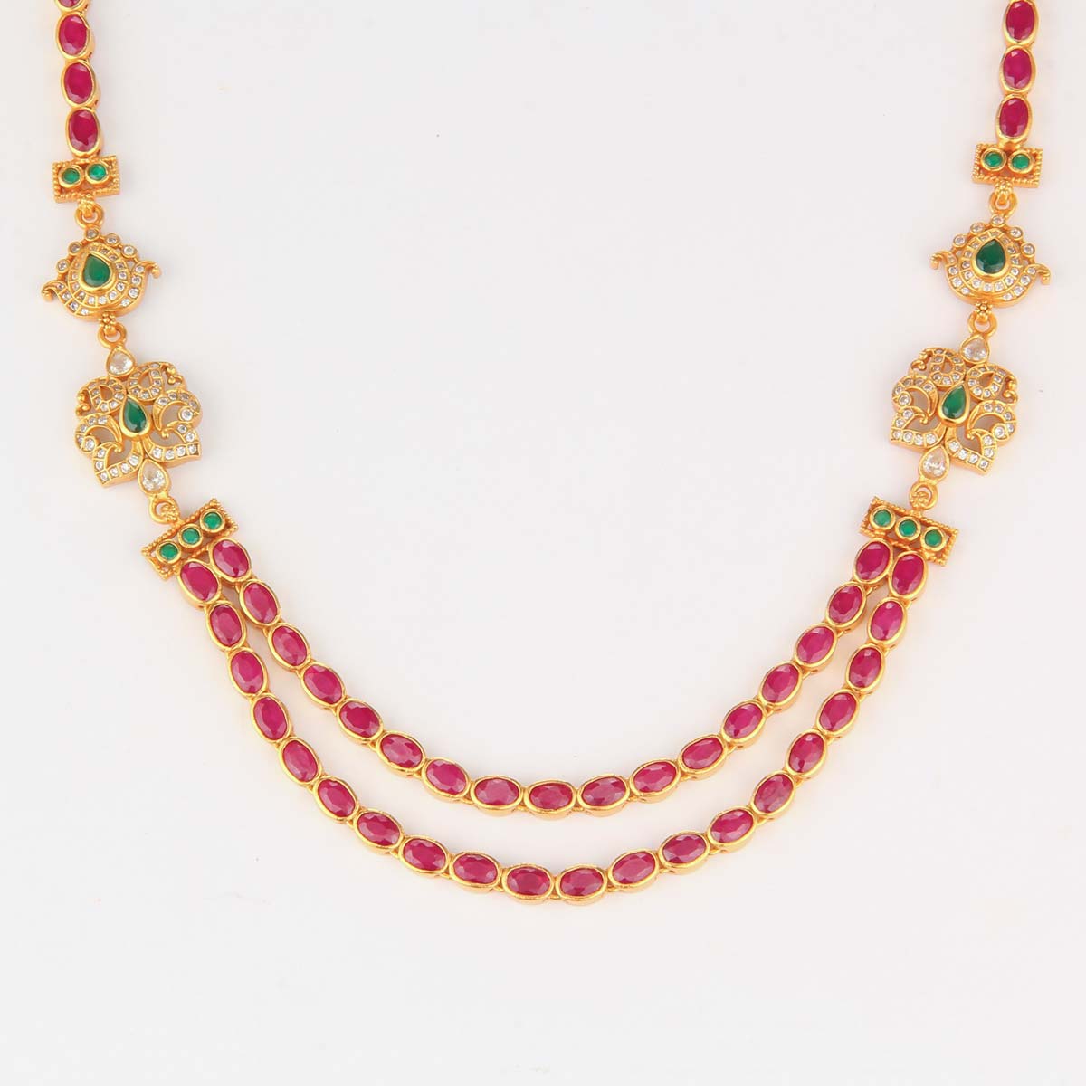 This 92.5 Silver, 24 kt gold-plated, stylish Necklace is studded with semi-precious stones to make a stunning statement. Perfect for any special occasion.