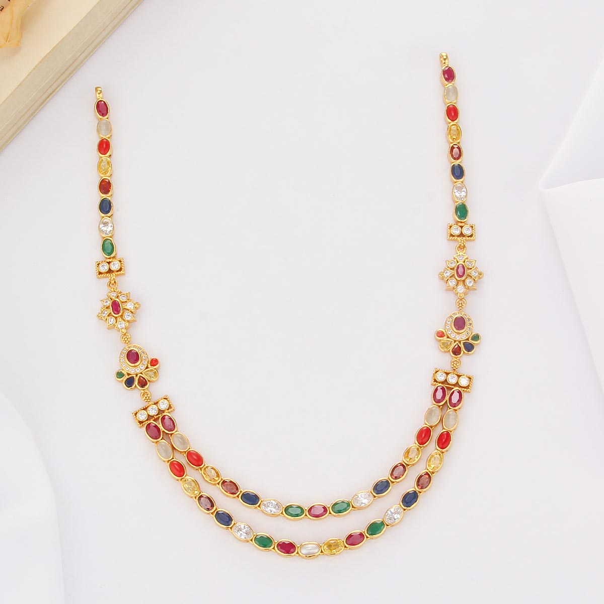 This 92.5 Silver, 24 kt gold-plated, stylish Necklace is studded with semi-precious stones to make a stunning statement. Perfect for any special occasion.