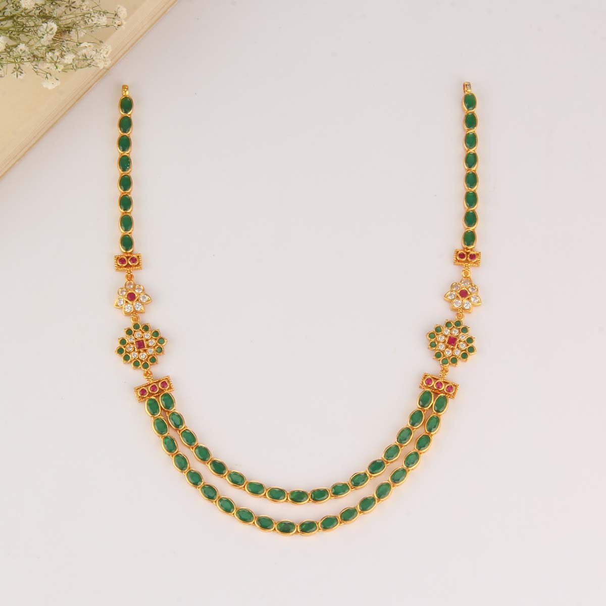 This 92.5 Silver, 24 kt gold-plated, stylish Necklace is studded with semi-precious stones to make a stunning statement. Perfect for any special occasion.
